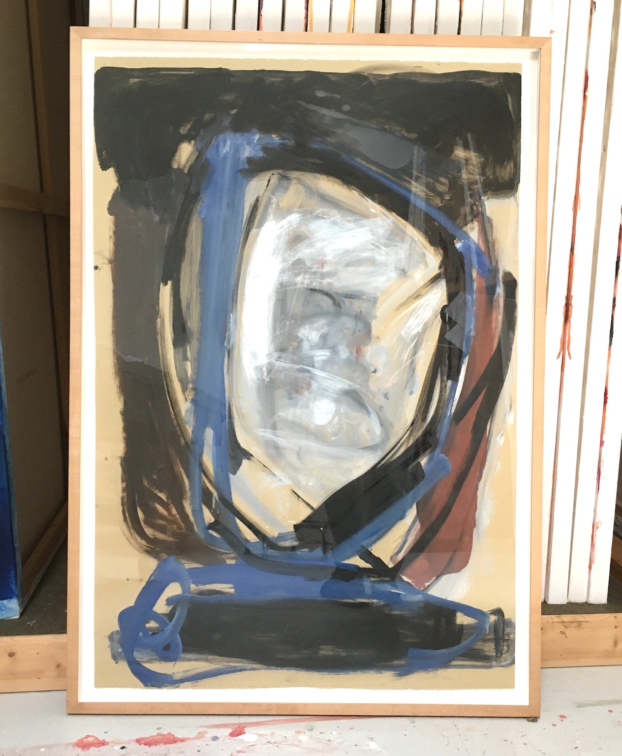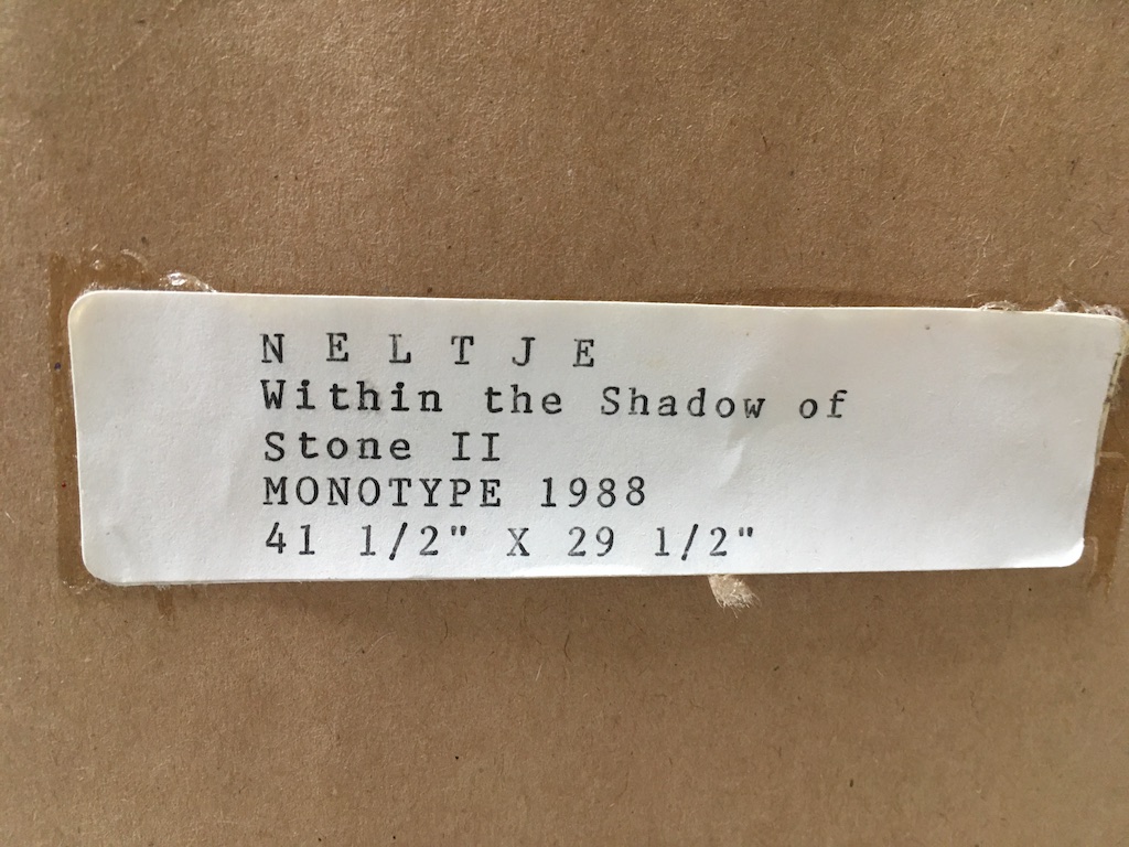 674 : Deckle edge paper. Black area across T. Black and blue large circles. Blue vertical area on L. Dark pink vertical area on R. Blue and black at bottom. BR: 1/1. Verso, backing board. Sticker TL: NELTJE / Within the Shadow of / Stone II / MONOTYPE 1988 / 41 1/2" x 29 1/2 inches.