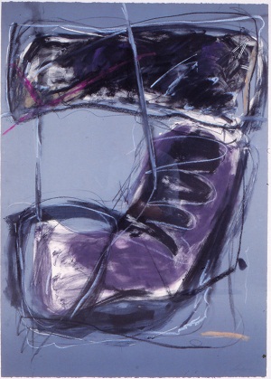 679 : Deckle edge paper. Gray background. White diagonal line from TC into C, then into BL. Dark pink lines in TL / TC. Short orange horizontal in BR. BR: 1/1 Neltje 88. Verso, backing board. TR: 10. Sticker below: NELTJE / The Turning Years / III / MONOTYPE 1988 / 41 1/2" x 29 1/2".