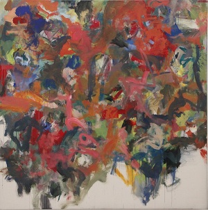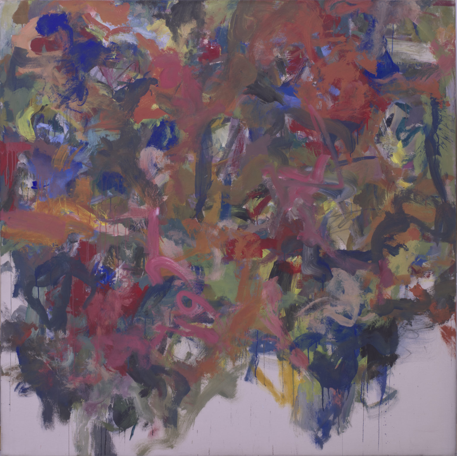 742 : Multiple, dense colors with white space across bottom. Colors include pinks, greens, blues, yellow, and red. Dripping paint. BR corner is white space with blue paint dripping down. On back. On both T vertical stretcher bars: 7AC/1990 Summer/Passing. Stapled upside down on BC stretcher bar: YELLOWSTONE / ART CENTER / 401 NORTH 27TH STREET, BILLINGS, MT 59101-1290 / NELTJE, SUMMER PASSING, 1990 / acrylic on canvas / 72 x 72 inches. Stretcher has screws and can be keyed.