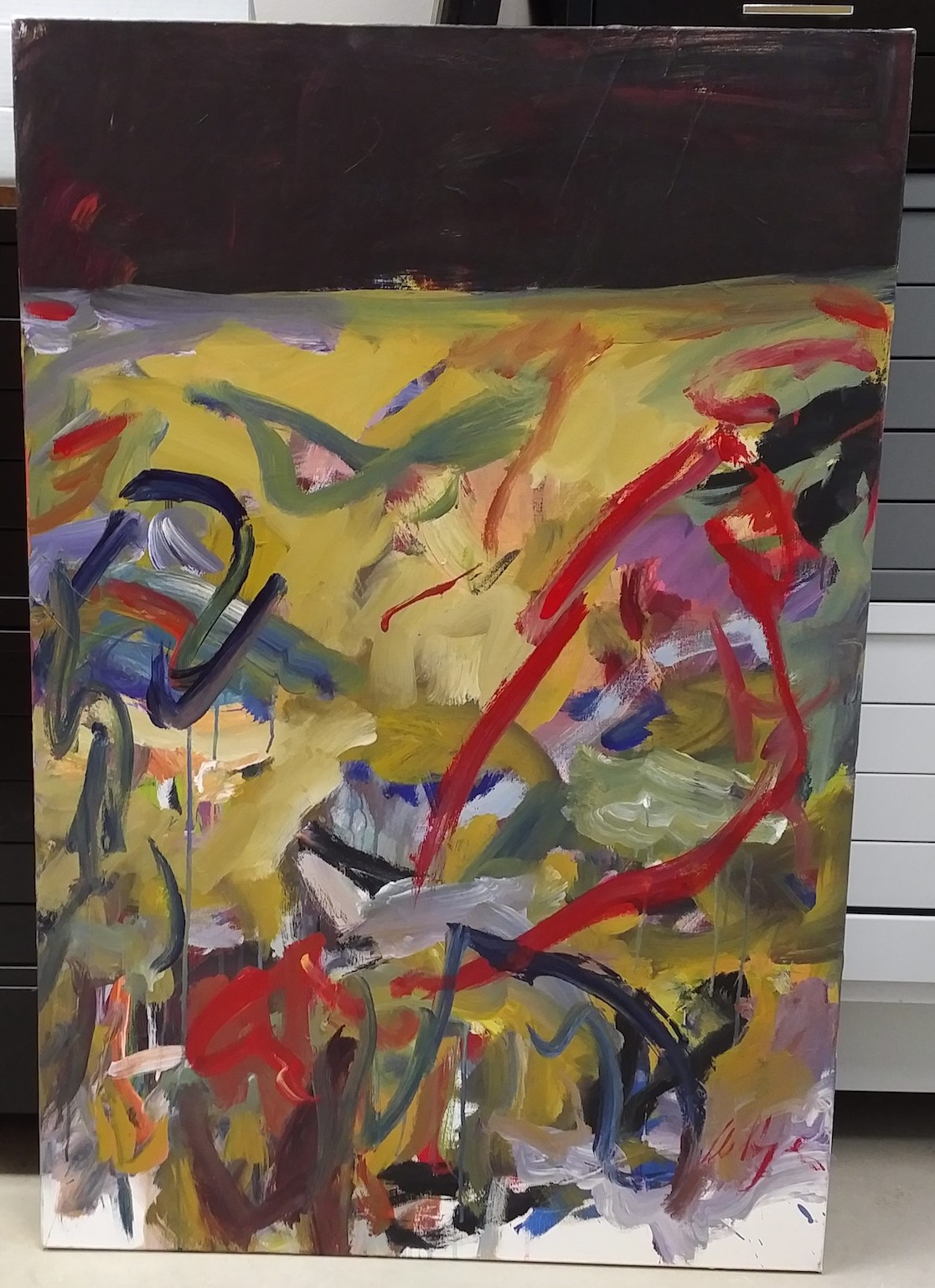 756 : Strip across top is dark with red undertones. Rest of painting is tans, greens, red, blues. White space in bottom corners. Dripping paint across bottom. Lavender and tan with red signature in BR. Verso. On TC vertical stretcher bar: Single Source. Stamped above: 48. Stamped on CL stretcher bar: 32. Sticker on C stretcher bar: NELTJE / Single Source / Acrylic on Canvas 1991 / 32" x 48" 51. Stretcher has screws and can be keyed.