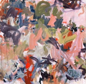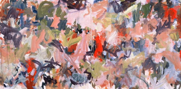 828 : Diptych. Colors are pinks, blues, greens, red. Numerous blue drips on L. Pink in C. Olive green in TC. Small areas of white space at bottom. Light pink in TR. Verso. TC vertical stretcher bar: Top. Below: Summer / Wish / 1992. Stretcher has screws and can be keyed.
