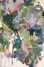 858 : Triptych. Hang with 3 1/2 inches between panels. Primarily greens with dripping across bottom. 2 dark pink drips in CL. White space across bottom. Verso. TC vertical stretcher bar: 14/93 / A / Far / Back / Into / The / Hills. TR/CR vertical stretcher bar: outside. Stamped on CR stretcher bar: 32. On BC vertical stretcher bar: 48. Stretcher has screws and can be keyed.