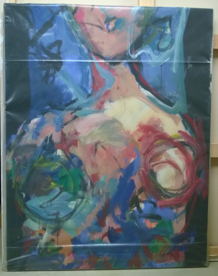 1021 : Abstracted nude woman from mid-face to abdomen. L and R edges are black. Background is blues, greens, and black. Breasts are suggested with 2 circular areas, left in black and yellow, right in reds and pinks. Verso. Crossed out on TC vertical stretcher bar: 53/95 / B. Sticker below: NELTJE / Corrected Dreams / Acrylic on Canvas 1998 / 54" x 42". Stamped upside down on CL stretcher bar: 42. Stamped on BC vertical stretcher bar: 54. BR stretcher bar: 42 x 54. Stretcher has screws and can be keyed.