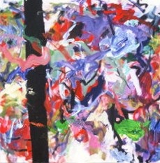 1219 : Triptych. Wide vertical black stripe R of L edge. Multiple colors including reds, pinks, blues, greens, yellow. Area of bright green in BR. Wide pink stripe cuts across black stripe in CL. A little white space along bottom and in TR. Verso. TC canvas: <arrow> M. TC vertical stretcher bar: 10B/2000. C stretcher bar, sticker: NELTJE Top / Roll My Bones / Acrylic On Canvas 2000 / Triptych 72" x 192" 10. Stretcher has screws and can be keyed.