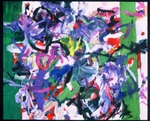1221 : Two green vertical stripes, one on L edge, one L of R edge. Rest of painting is greens, blues, purples, pinks, reds, white, black. Red drips in BC. Yellow and green area in C. Verso. TR vertical stretcher bar: 11/2000. Sticker on C stretcher bar: NELTJE Top / Moroccan Suite I / Acrylic On Canvas 2000 / 68" x 74" 11. Stamped on both TC vertical stretcher bars: 64. Stamped on both CL stretcher bars: 78. Stretcher has screws and can be keyed.