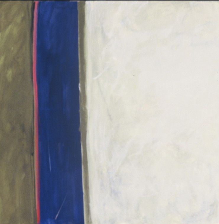 1342 : Diptych. Vertical color areas beginning with white with blue / green (almost half of canvas), then wide green, narrow pink, wide blue, narrow dark pink, wide green. Verso. Upside down on CL stretcher bar: <symbol> DEAD <symbol> STRAIGHT.