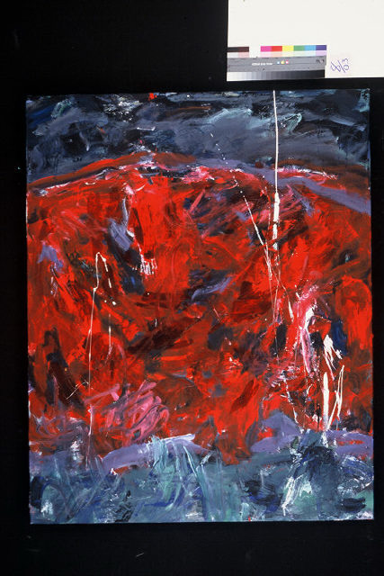 1481 : Primarily reds across center. Blue and black across top. Blues across bottom. Vertical streaks of white on right from top, almost to bottom. Vertical streaks of white on left in center. Heavy paint use. Verso. TL vertical stretcher bar: Ready / to / Leap / 2003 / 8 / 03. Sticker on C stretcher bar: Neltje / Read to Leap / Acrylic on Canvas / 2003. Stamp on CL stretcher bar: <symbol> DEAD <symbol> STRAIGHT. Crossed out on CR stretcher bar: illegible numbers / 2000 / Not a Good / Place to / Hide. On BC stretcher bar: 55 3/4.