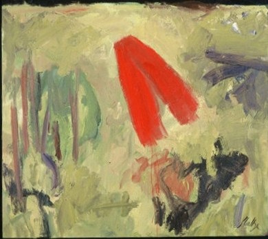 1487 : Strip of black across top, rest of painting is primarily tans / beiges. 2 thick red lines ("arrow" shape) in C. Some purple in CR. Green and reddish in CL. Verso. In marker, crossed out on TC vertical stretcher bar: 2/96 15/98 37/99 19/2000. Not crossed out: 65/03. Sticker in C on stretcher bar: NELTJE Top / Make No Mistake in Meaning / Acrylic On Canvas 2003 / 48" x 48" 65/AC/2003. Stretcher has screws and can be keyed. On TR inside stretcher bar: 48 x 48. Stamped on CL and BC: 48.