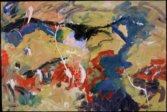 1493 : Bright colors including yellows, blues, reds, purple. White paint spatters. Black horizontal line from TL to TR. Areas of red across bottom half. Vertical blue in right half with purple at bottom. Verso. In pencil on TC vertical stretcher bar: Imaginable / Sum / 48/03. Stamped below: <symbol> DEAD <symbol> STRAIGHT. Sticker in C on stretcher bar: Neltje / Imaginable Sum / Acrylic on Canvas / 2003.