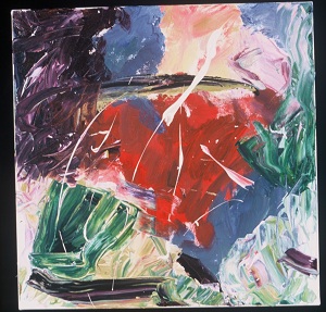 Colors include red, purple, blues, greens, tans white. TL and CL are primarily purple. C is primarily red. BL has an area of green with some tan in it and a a horizontal purple and black stripe below. Verso. On TC vertical stretcher bar: Of Wet / And of / Wildness / 2003 39/03. Stamped below: <symbol> DEAD <symbol> STRAIGHT. On C stretcher bar: 19 3/4. Sticker: NELTJE Top / Of Wet And Of Wildness / Acrylic On Canvas 2003 / 24" x 24" 39A2003.