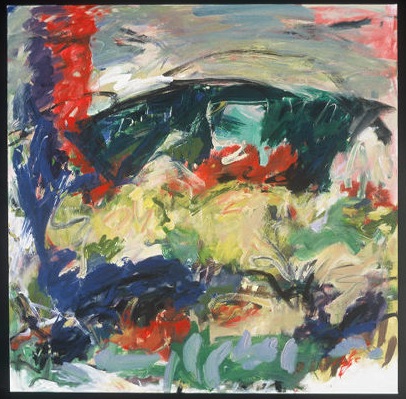 Top third is blues with a vertical red section on TL and some pink in TR. Rest of the painting is greens, yellow, blues, red, black. Large area of yellow in C with some red above it. Verso. On TC vertical stretcher bar: 47/03. Through / Curling / Air. Stamped upside down on CL stretcher bar: <symbol> DEAD <symbol> STRAIGHT. Sticker on C stretcher bar: NELTJE Top / Through the Curling Air / Acrylic On Canvas 2003 / 48" x 48" 47A2003. Hanging tag on CR stretcher bar: Through / Curling Air / Acrylic / 48 x 48. Back of tag: $3800 / Neltje.