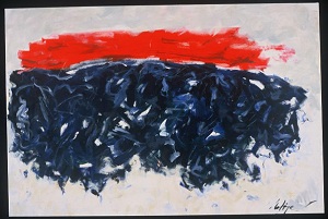 1543 : Edges painted white with hints of color. Area across top is reds. Rest of painting is primarily blues. Some red drips into blue. Some scratching (intentional) throughout. Verso. TC vertical stretcher bar: 35/03. Stamped below: <symbol> DEAD <symbol> STRAIGHT.