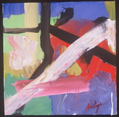 1603 : Colors are blue, white, yellow, greens, reds, pink, black. Diagonal white (with streaks of other colors) from TR to BL. Pink horizontal stripe from BL to BC. Yellow vertical from TL to CL. Verso. TC, edge of canvas: May 2004 21/04 Unburied Pleasure IV. Stamped on C vertical stretcher bar: <symbol> DEAD <symbol> STRAIGHT. On BC vertical stretcher bar: 19 3/4.