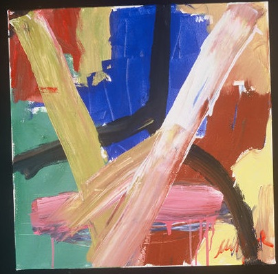 Colors are white, blue, green, browns, pink, black. Diagonal white with browns and pinks, runs from TR to BC. Brown diagonal runs from TL to BC. Horizontal pink runs from BL to BR. Verso. TC, edge of canvas: May 2004 22/04 Unburied Pleasure V.