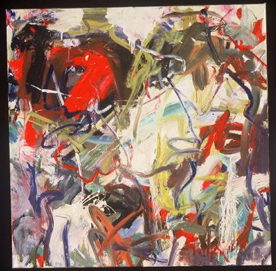 1612 : Multiple colors include tans, yellow, reds, greens, blues, grays, black. In BR is an area of light colored vertical, spattered paint. TL and TC have areas of beige that are dripping a little. Verso. On TC vertical stretcher bar, crossed out: Conflicting Desires. Below: 52/2004. Below, crossed out: Sept 2004. Below: Nov. 2004 Muscle / Of My / Mind. Upside down on CL stretcher bar: 31 3/4. Stamped on CR stretcher bar: <symbol> DEAD <symbol> STRAIGHT.