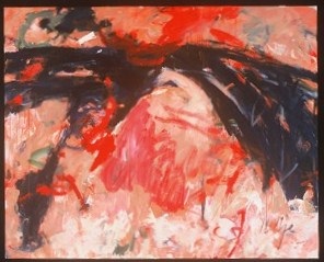 1631 : Dark area, blues and black, across top (but not to edge) and down into CR / BR. Small dark area in BL. Rest of painting is pinks, peach, red, white, green. Red drips in TC and CL. Verso. TC canvas edge: A BRAIDED VOICE 4/04 / 26/04. TC vertical stretcher bar, sticker: NELTJE Top / A Braided Voice / Acrylic On Canvas 2004 / 48" x 60" 26/AC/2004. Stamped below: <symbol> DEAD <symbol> STRAIGHT. BC vertical stretcher bar: 43 3/4.