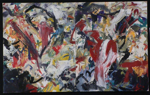1680 : Diptych. Multicolored with red, black, blues, yellows, and white. In TR is a white area with blue streaks in a "waterfall", white paint has heavy drips. Verso. In pencil on TC vertical stretcher bar: Pass Me / The Almond / Cookies / A / Jan 2005/9. CL stretcher bar stamp: <symbol> DEAD <symbol> STRAIGHT. In pencil on CR stretcher bar: 43 3/4.