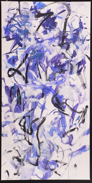 1693 : 4 pieces. Blues, lavender, black with a lot of white space. Lighter colored drips throughout. 2 drips on L and one on R go from TL and TR to bottom edge. Verso. Signed on back TL: Neltje 3/05. Stamped on CL stretcher bar: <symbol> DEAD <symbol> STRAIGHT. Next in C: 33A/2005. Next on CR: BREEZE DANCE A.