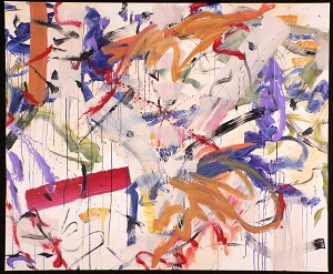 1699 : A lot of dripipng and white space. Colors are browns, blues, reds, greens. Red spatters in C. Brown vertical brush stroke in TL. Red horizontal brush stroke in BL. Verso. TC vertical stretcher bar: 30/AC/2005. Sticker: NELTJE Top / I Couldn't Resist / Acrylic On Canvas 2005 / 60" x 72" 30/AC/2005. Stamped upside down on C stretcher bar: <symbol> DEAD <symbol> STRAIGHT. Next: 67 3/4.