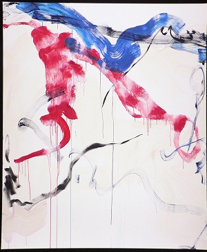 1701 : Diptych. Colors include red, blues, black. Blue across top, drips. Red in TL / CL / C / CR, drips. Stripes of 6 blue/black, parallel lines, snake around canvas. A lot of white space. Verso. TC vertical stretcher bar: 31-B / 2005 / Fancy / Flight / Panel B / of Diptych. Below: 67 3/4. Stamped on BC vertical stretcher bar: <symbol> DEAD <symbol> STRAIGHT. Written below: 67 3/4.