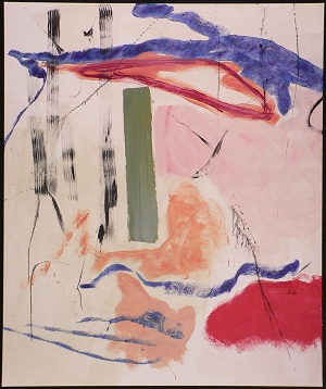1708 : Diptych. Background is white. Vertical green line in C. Black vertical lines on L. Large pink area in C / CR. Red in BR. Horizontal blue area across T. Verso. TC vertical stretcher bar: 32A-2005 / Follies & Foolishness. BC vertical stretcher bar: <symbol> DEAD <symbol> STRAIGHT. Below: 67 3/4.