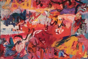 1764 : Primary colors are pinks, orange, and blues. Mixed Media material is hand-made paper and foreign language newspaper. Newspaper in TL / TC appears to be a TV listing. Hand-made paper in CL / BL has red, blue, and white paint on top of it. *Changed in 2011. Paint added, especially dark red around the edges and BR. Dark green lines throughout. **Changed again. None of the newspaper shows through anymore. Black drips from C into BC. Peach in TL / TC / BR. Verso. In red marker on TC canvas edge: 78 x 57. On TR vertical stretcher bar in marker: 28AC / <numbers crossed out> 16AC/2006. In pencil, upside down, on CL stretcher bar: 80 3/4.