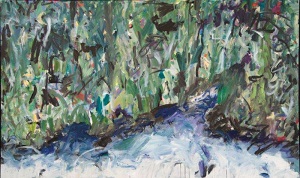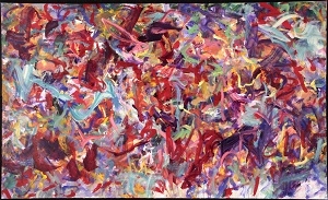 Multiple colors including purple, blues, greens, yellow, and black. 6 sections of paper are attached and partially painted over. Long piece of paper in BL is jagged on left edge. *Completely repainted, no paper is showing. T 3/4 is primarily vertical greens - creates a forest-like look. B 1/4 is blues, light blue along B edge. **Another complete repainting in 2011. Bright colors, a lot of red. Teal in CL and TR. Red "W" shape in BC. Pink "fish" shape in TC. Red spatter in TL. Verso. In pencil on TC stretcher bar: That's The Arbor In My Head. Next in blue marker: 20/AC/2006 94 x 57. In pencil 2006 has been scratched out and written in: 2009. On both bottom vertical stretcher bars: 52 3/4.
