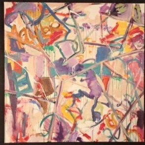 1835 : Drips throughout. White spatters. Written in orange in TL: Maybe. Purple and tan diagonal lines throughout. White space throughout. Verso. TC vertical stretcher bar: 12AC/2010 / Tamp / Down / Memories. BC vertical stretcher bar: 43 3/4.