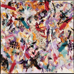 1840 : White space primarily in corners. Pieces of foreign language newspaper. Dark orange hand made paper in TC / CR / BL. 7 pieces of purple hand made paper. Darker paint colors. *Changed in 2011. A lot of red added. **Changed again in 2011. Now part of a triptych (1st part) with 2010.506.0 and 2010.508.0 (but can still stand alone). Orange paint chunks added in TL and BL. Multi-colored paint chunks in CR. ***Changed again in 2011. Stencil letters added. White spatters added. Orange paint chunks removed. Verso. TC vertical stretcher bar: Tidal / Pools. CL stretcher bar: 43 3/4.