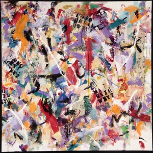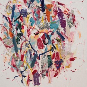 1841 : White space in corners and R edge. Green crosshatched paper in CL and BC. Foreign language newspaper throughout. Red paper in C. Lighter paint colors along with red. *Changed in 2011. Darker paint colors added, red lines throughout. **Changed again in 2011. Now part of a triptych (2nd part) with 2010.506.0 and 2010.507.0 (but can still stand alone). Teal paint chunk in BL. Blue paint chunk in TR. ***Changed again in 2011. Stencil letters added. White spatters added. Verso. TC vertical stretcher bar: Rivering / of / Sound. CL stretcher bar: 43 3/4.