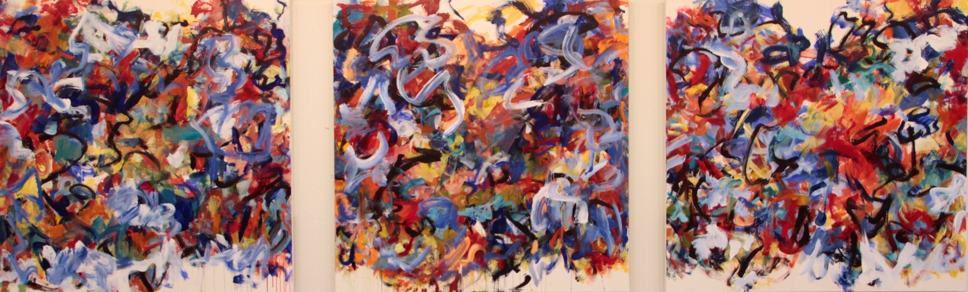 May be third panel in triptych. White space in TC. Red drips in C. Two short light blue lines in CL on edge. A little white space across B. Verso. TC stretcher bar: 1C/AC/2013 / Triptych / Twisted / Yesterday. Stretcher can be keyed.