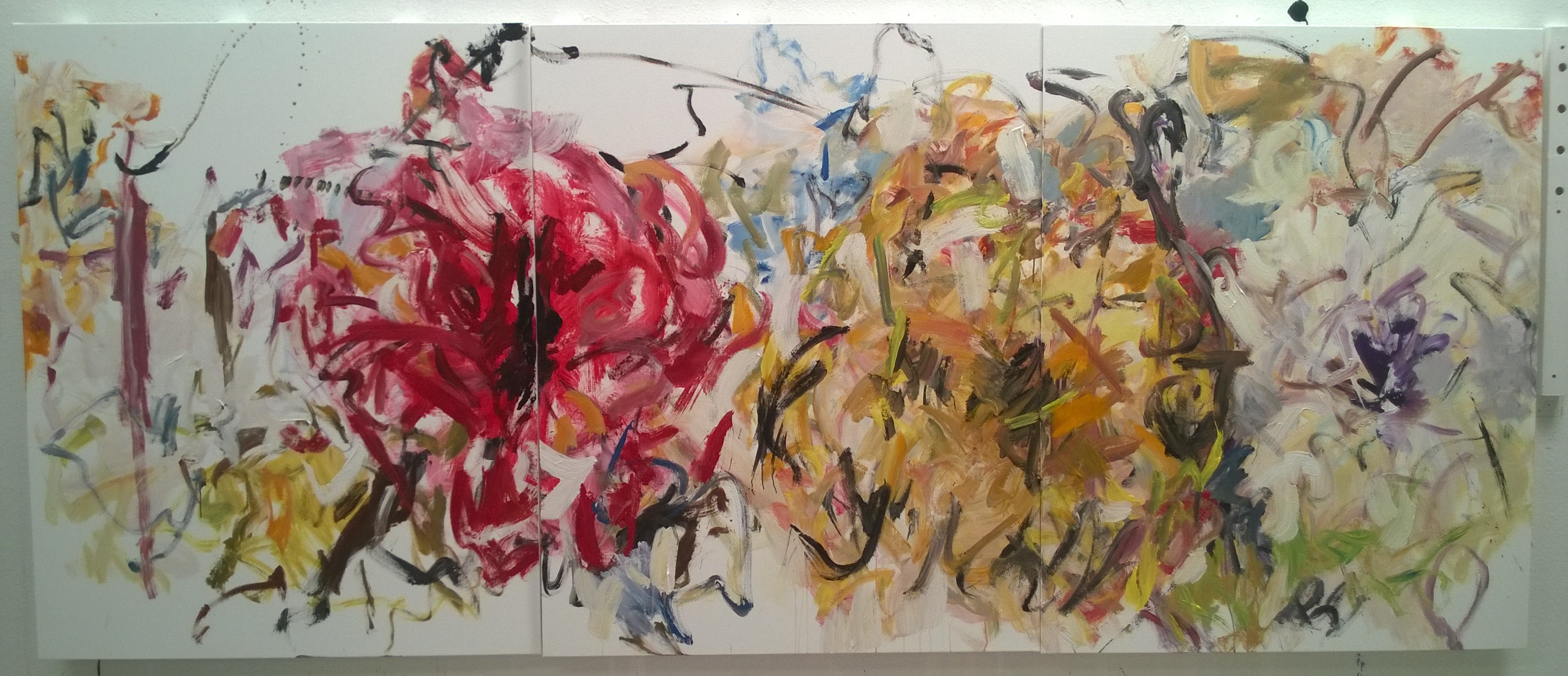 Right portion of triptych. Continuation of darks CL with yellow green surround. Similar circular area of lighter color surrounding darker blue purple CR. Dark strokes between going TR to BC.