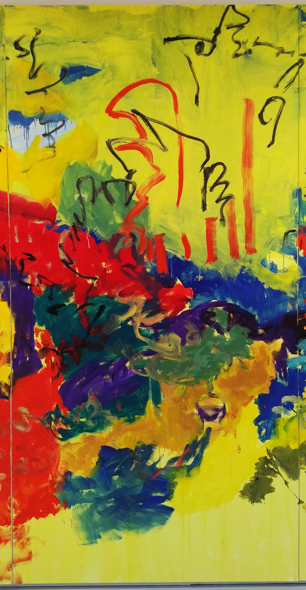 3154 : Acrylic painting. One panel of six, second in from right. Much yellow space. Five vertical straight red brush strokes CR to C decreasing in height towards C.