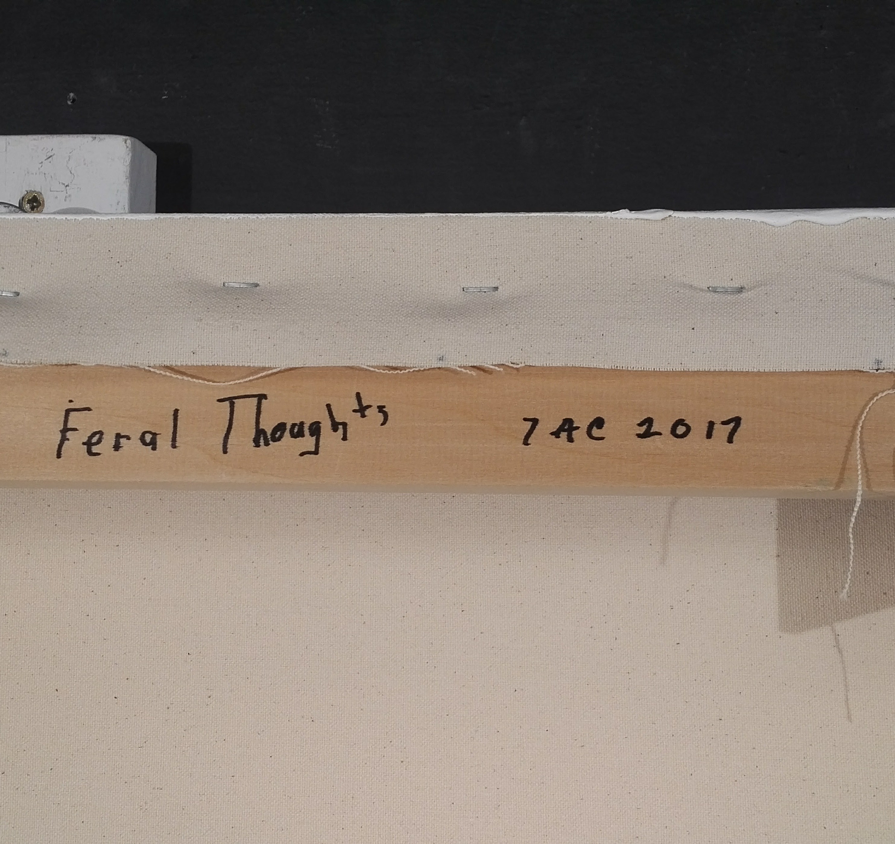 Acrylic. Black arc vertex at TR. TL and TR corners heavy blue areas. Five nearly parallel vertical lines BC. Signature BR. Verso TC title and 7 ac 2017.