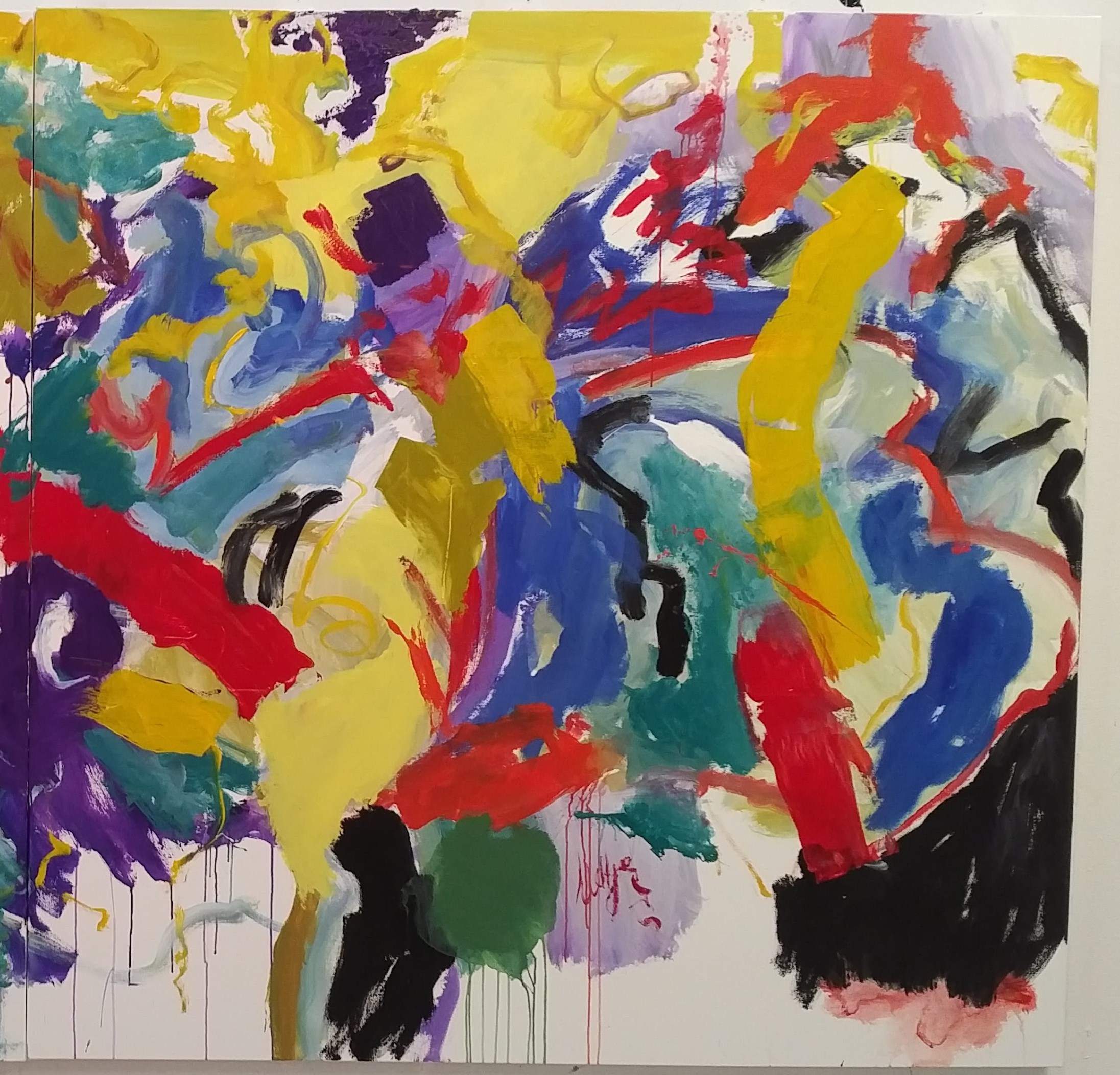 3141 : Acrylic Diptych. Right panel of two. Black almost triangular area BR. Signature BC. Color areas many of which are dripping into other areas especially white area across bottom. A couple heavy read lines or bars one in CL and the other above black in BR.