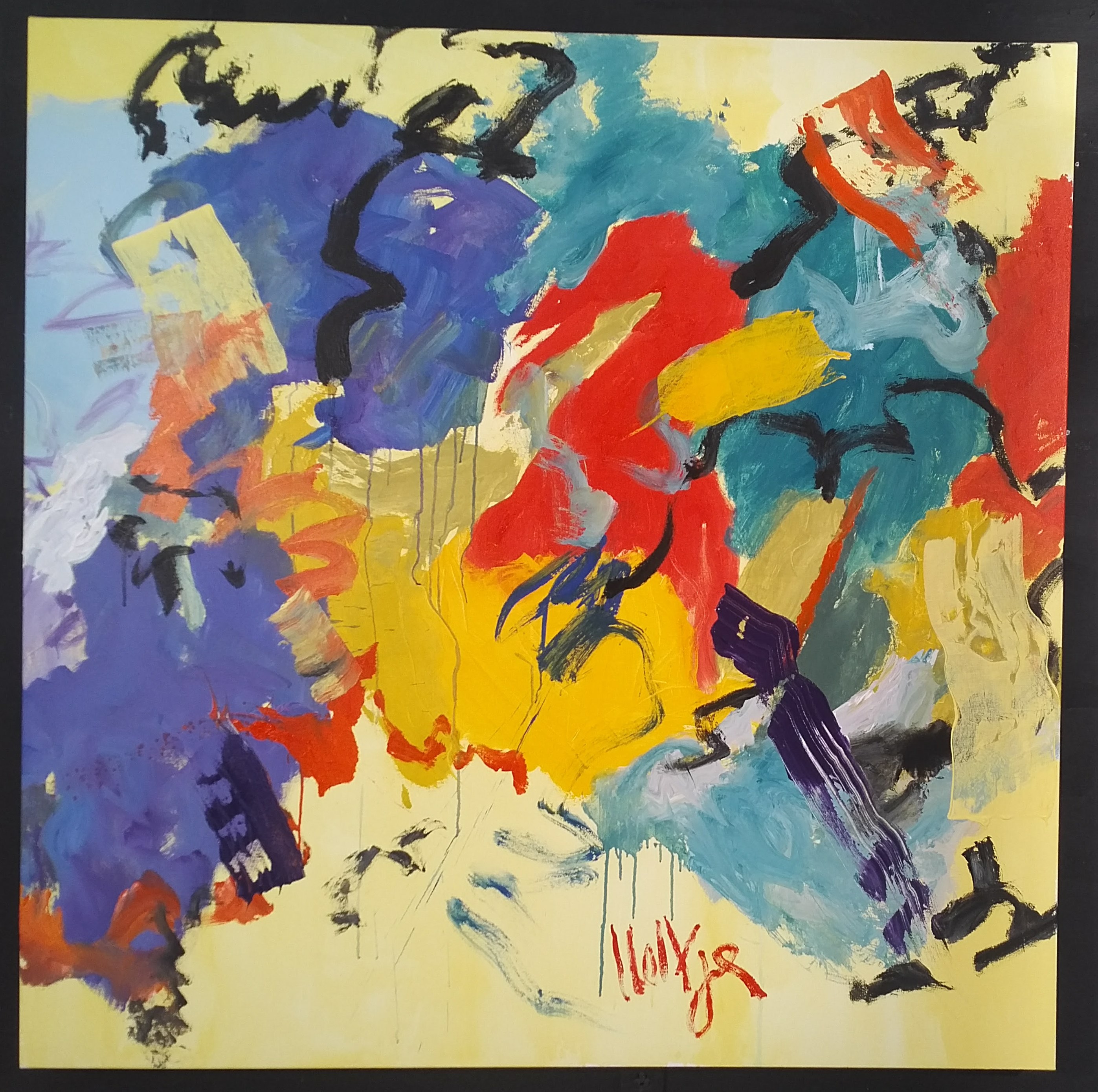 3148 : Acrylic. Right panel of two. Signature bottom right. Blue/grey areas TL. Two blue areas R. Yellow and orange and red in C. Red along CR edge. Medium to heavy black lines and squiggles across TL and throughout.