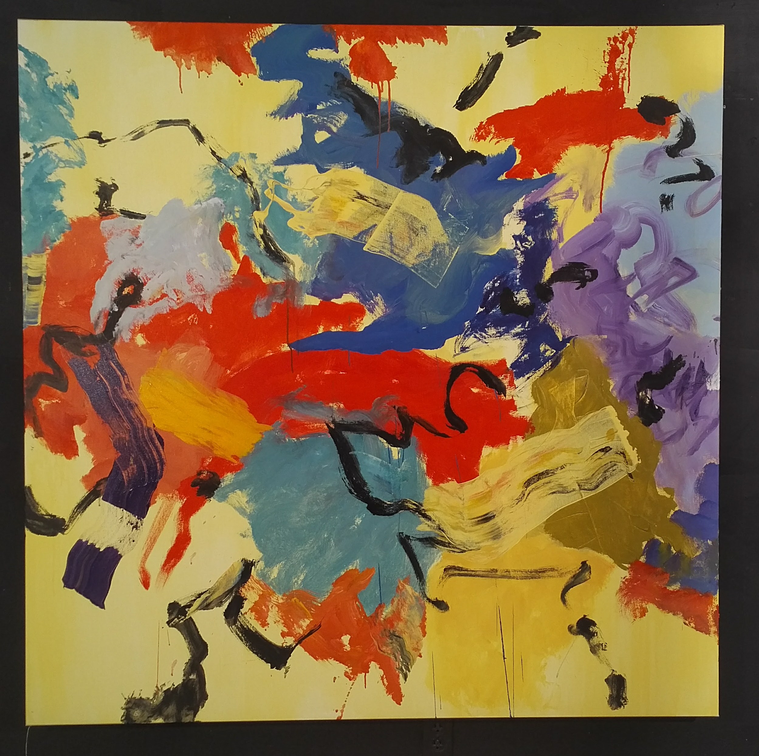 3149 : Acrylic. Left panel of two. Signature on other panel. Largely yellow background with areas of reds, greys and blues. Greyish blue along CR edge. Red and blue areas have wider scrapings or troweled on yellow. Some medium to heavy black curlies and squiggles throughout.