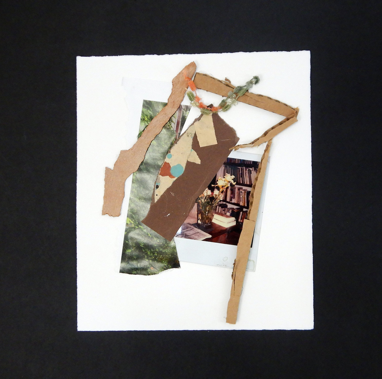 3530 : Collage on deckle edged paper. Polaroid instant photo in C layered under cardboard and colored paper and cutting from magazine. Instant photo portrays a table, vase, flowers, books on bookcase.