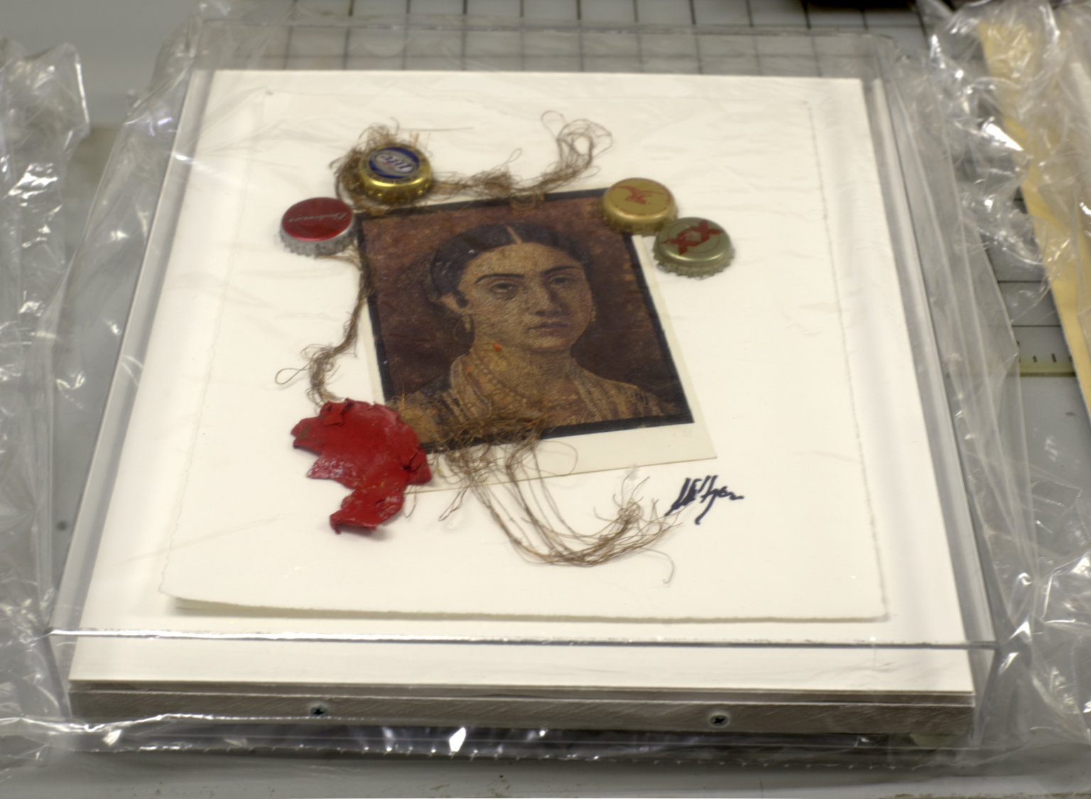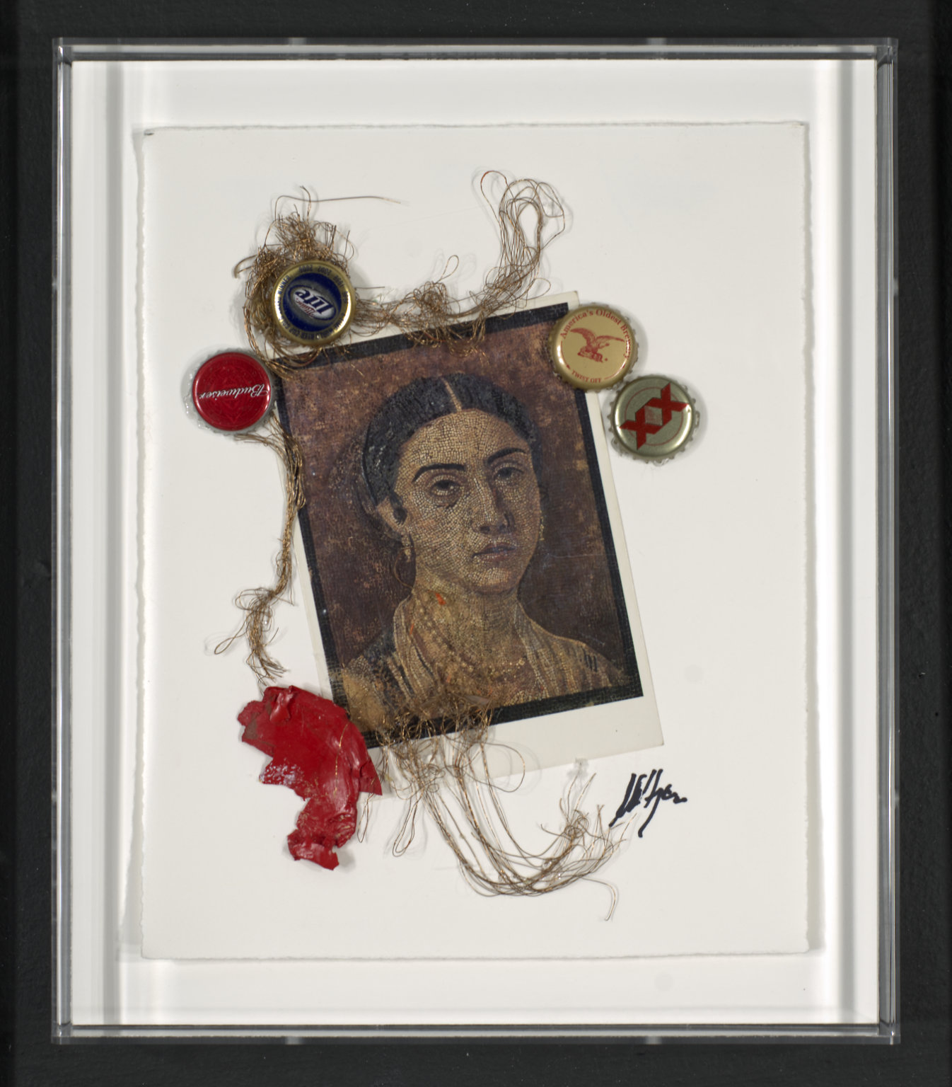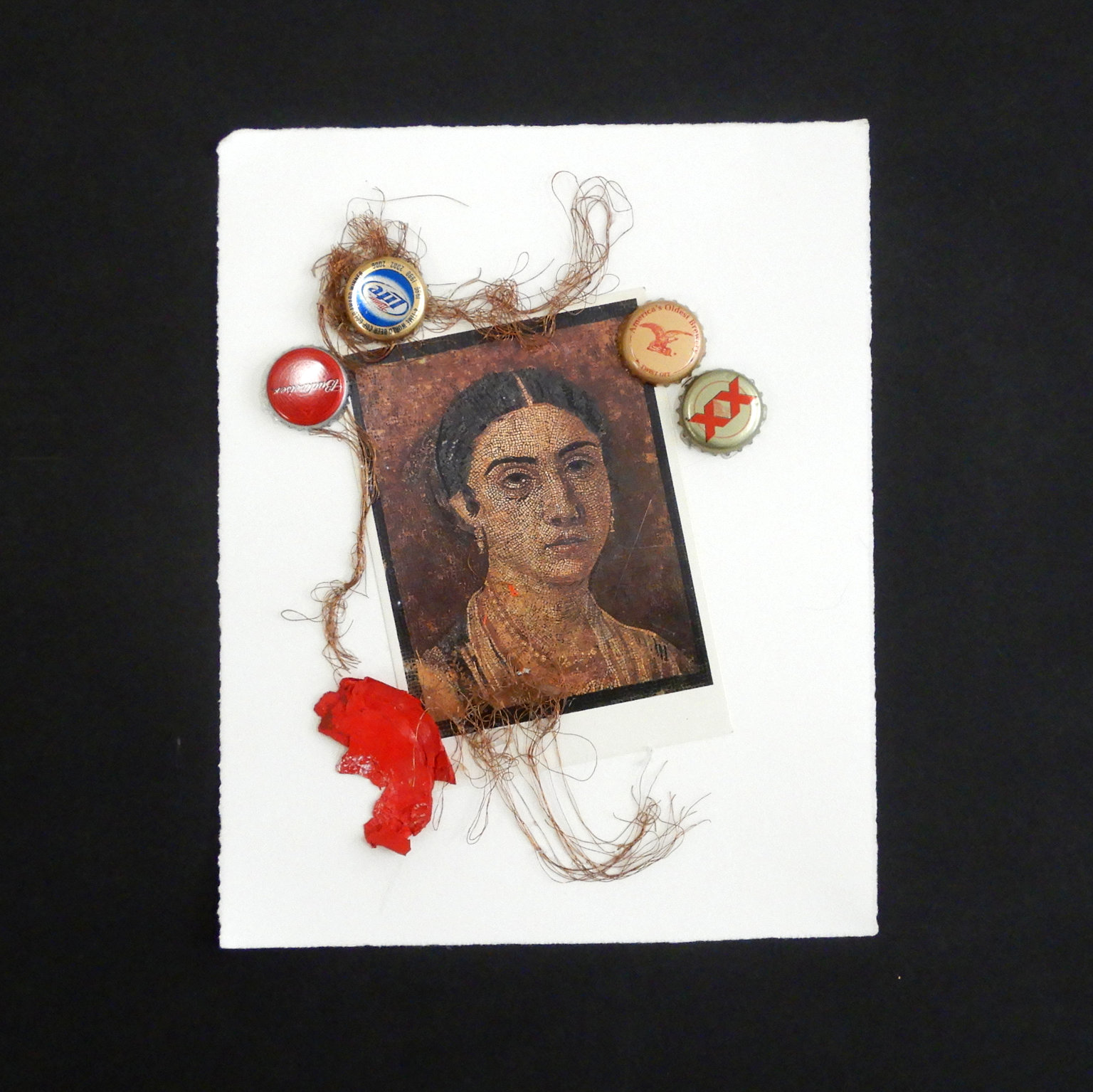 3546 : Collage on deckle edged paper. Postcard in C portraying painting of individual wearing hair parted in center and pearl necklace. Four bottle caps arranged in TL and TR, two each. Dried red paint BL and twine curving and curling about TC to BC through CL.