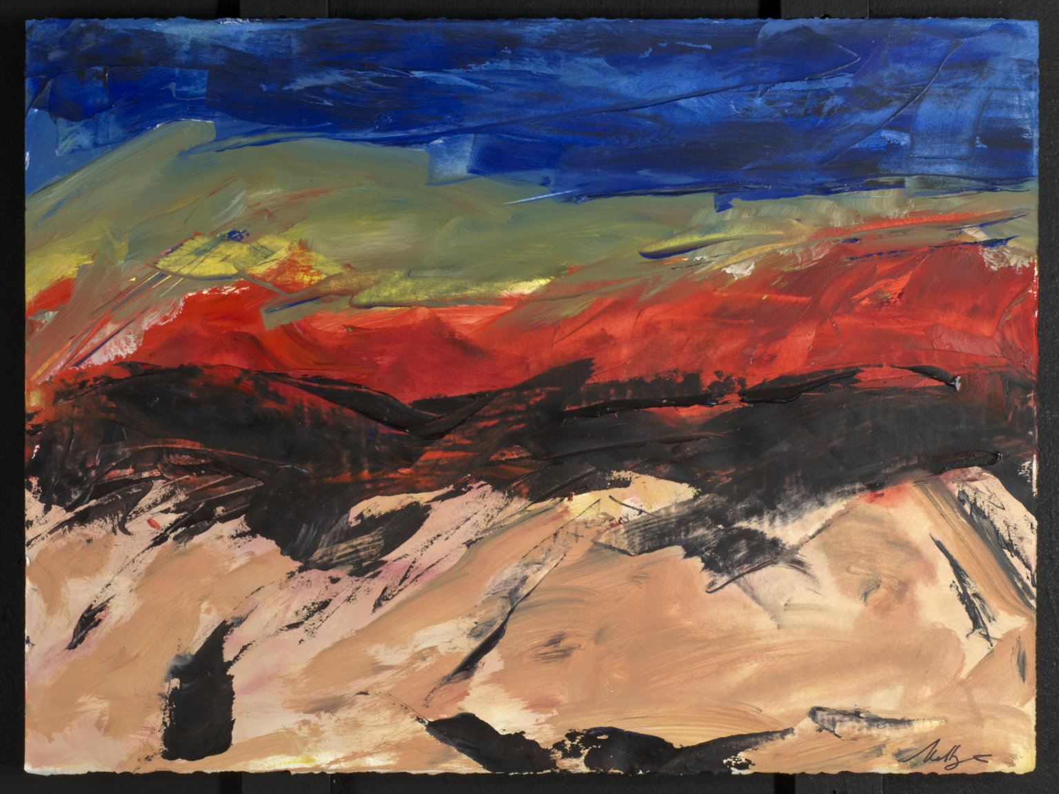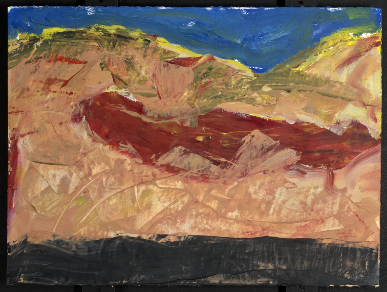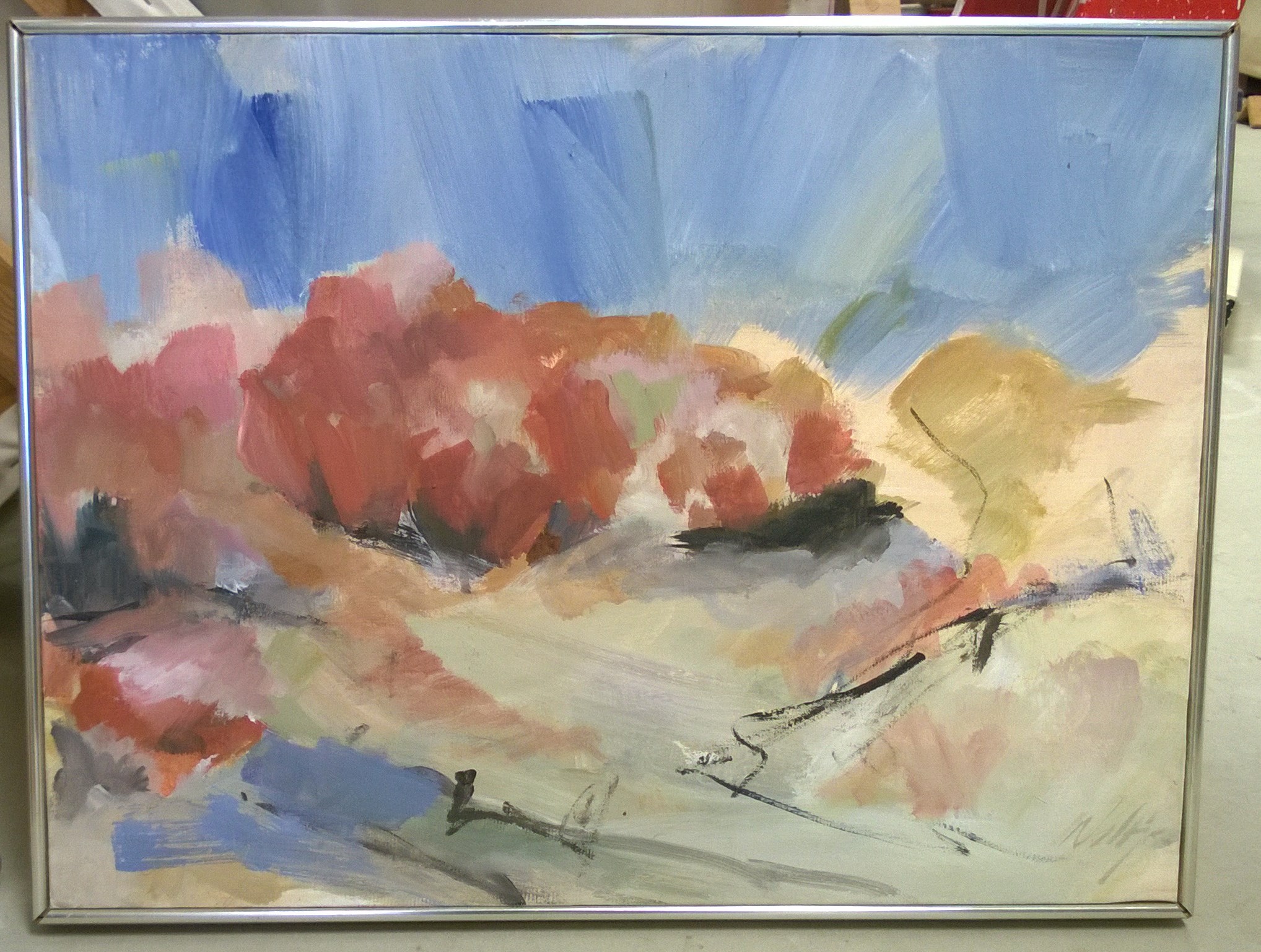Blue sky at top. Reddish hills in CL / C. A little blue in BL. Light tan in CR. A little lavender in C. Neltje painted this when she was taking an art class. The class was at the Banner store, painting landscapes. The teacher said that this painting was the best in the class, so she never finished it - she didn't want to ruin it. Verso. TC, stretcher frame, upside down: 24. Stamped in TL stretcher frame: 18. Stamped in TR and BL stretcher frames: 24. Stretcher can be keyed.