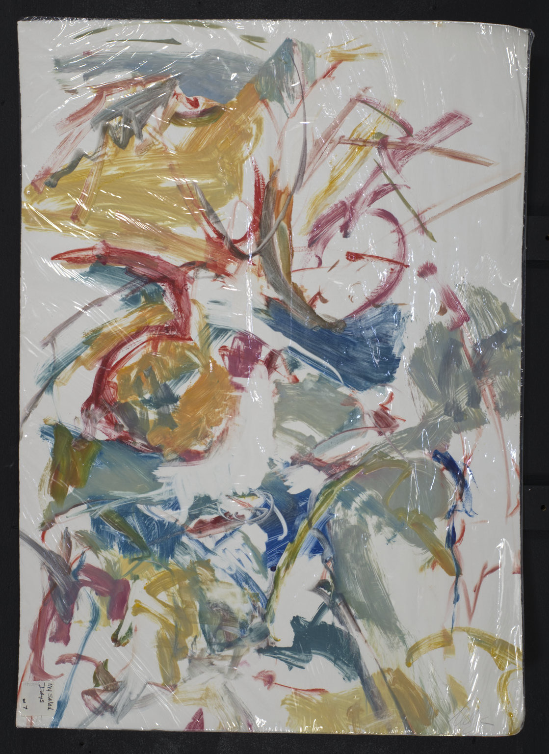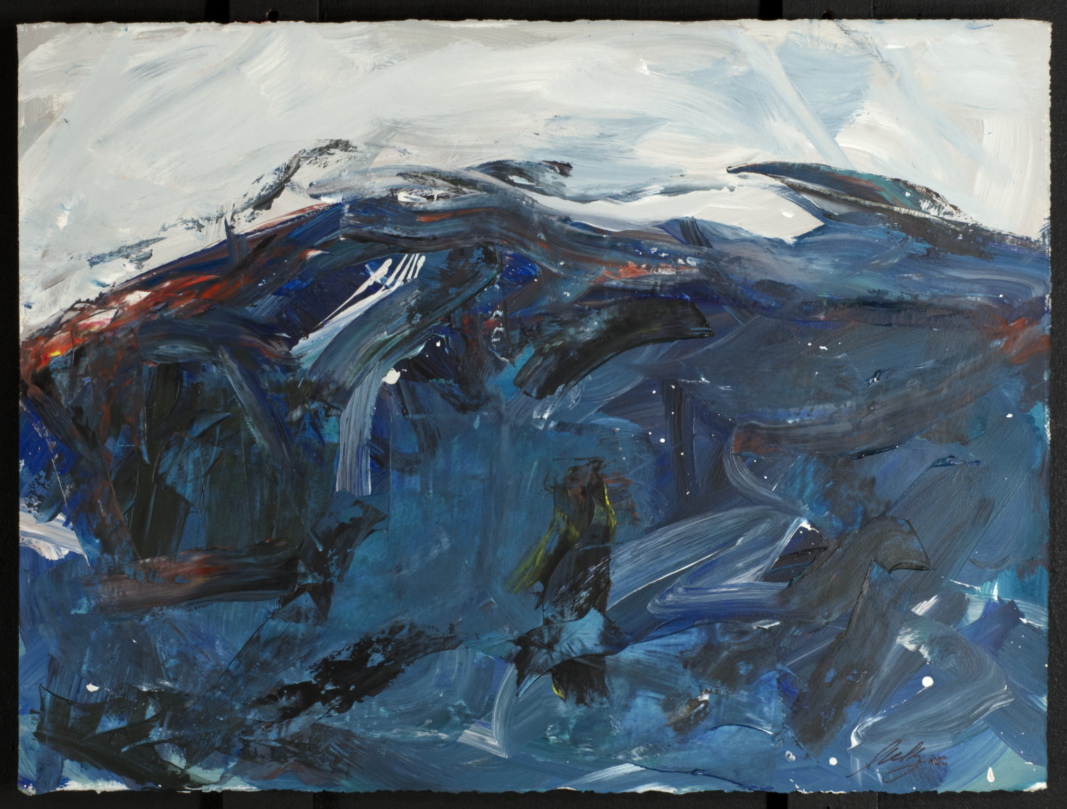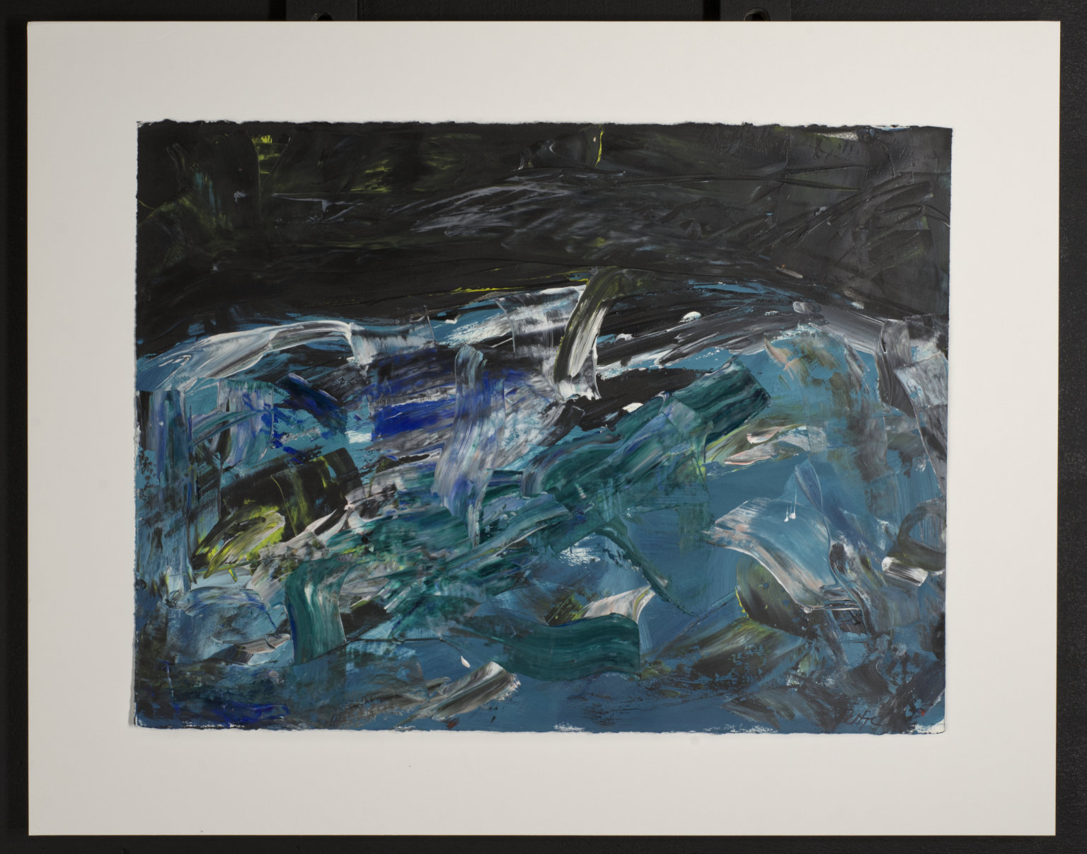 Top quarter is whites and blues. Rest of painting is primarily darker blues. A little red across C. A little yellow in BC. Verso. TC: Emptying / To Swell / Again. All 4 corners: 15/02. Watermark BL: BFK RIVES / FRANCE <symbol>.