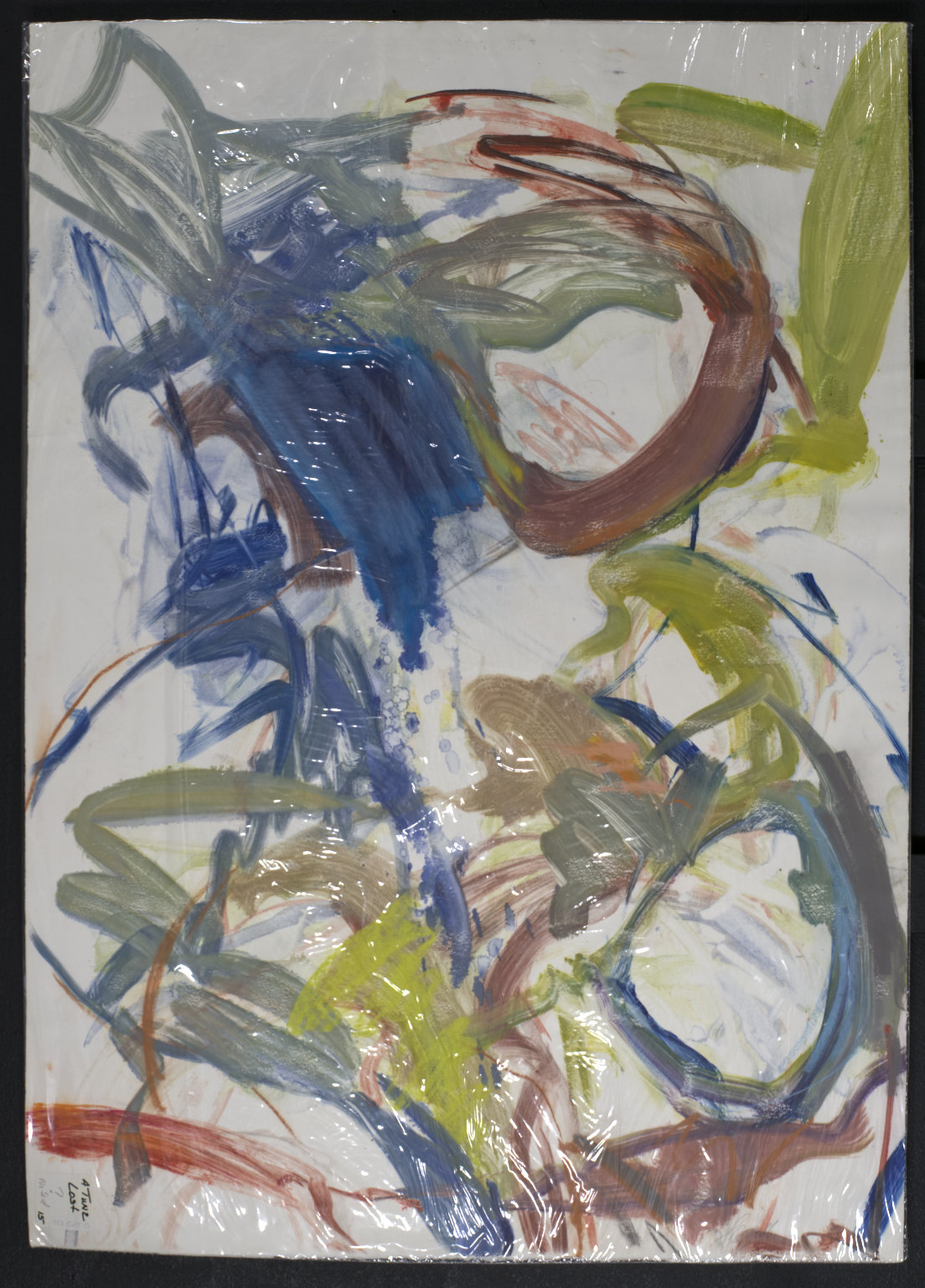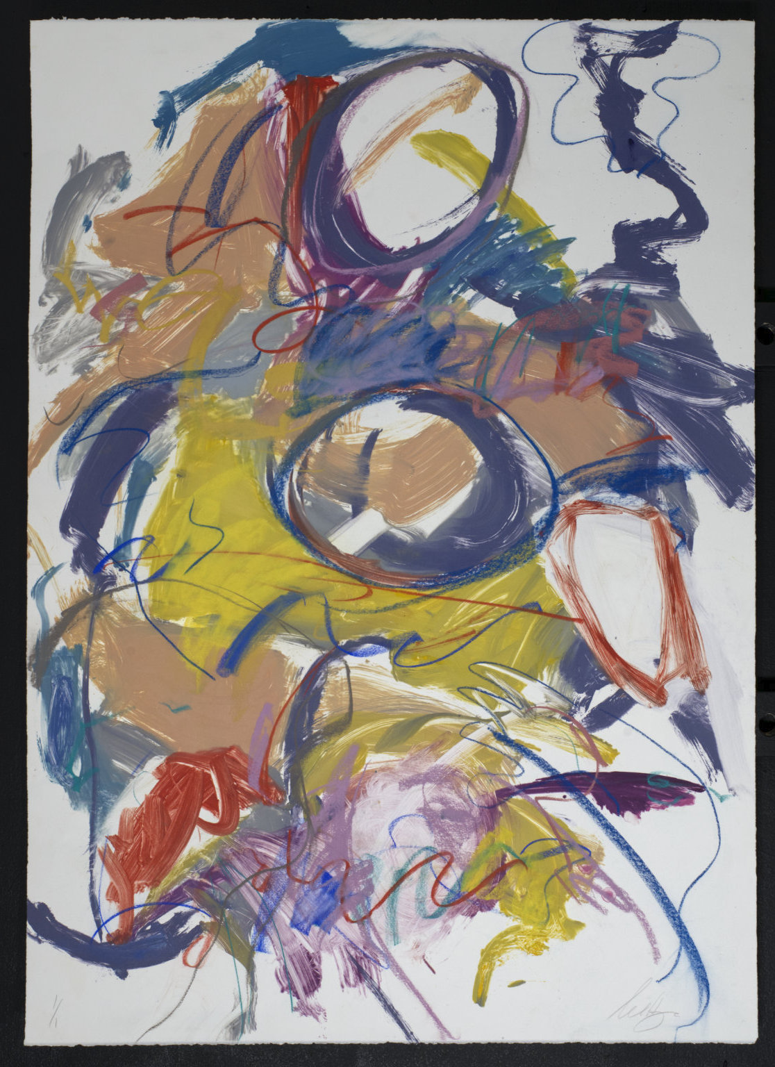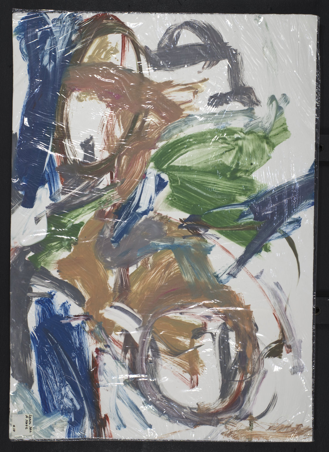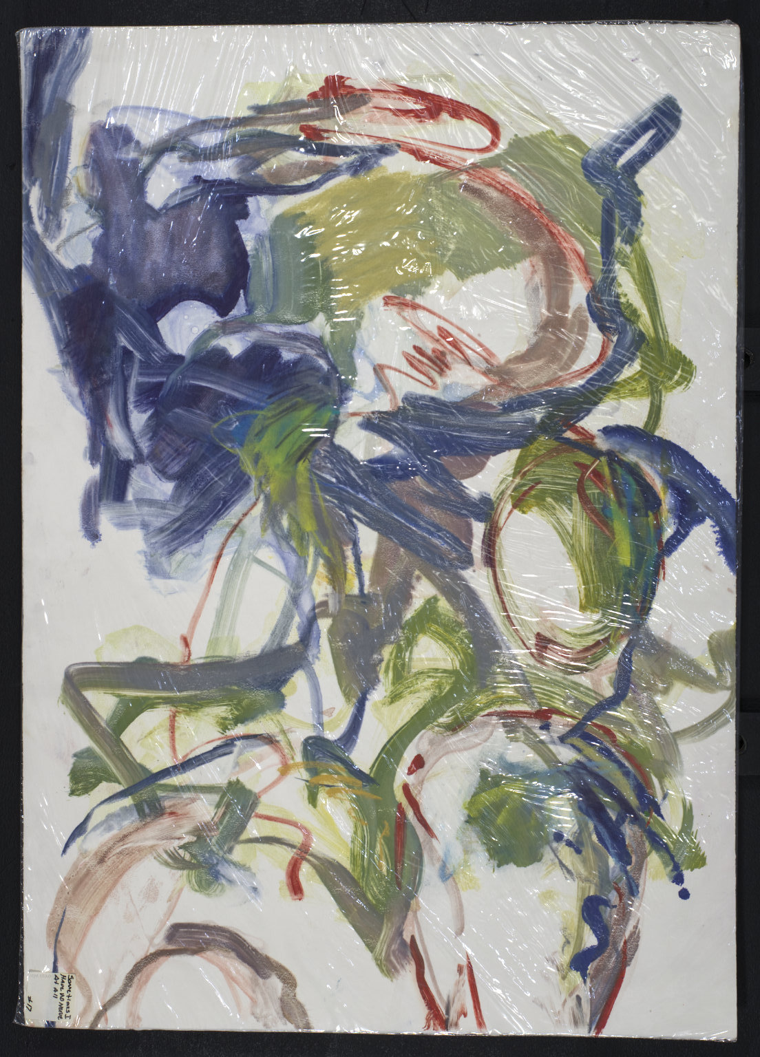 Deckle edge paper. White space throughout. Red / green circle in CR. TL / CL are primarily blues. Reddish lines down C and in BR. Verso. BR: Sometimes I hae no nerve at all 1986 <?> / #17. TR: 17. Shrink wrapped.