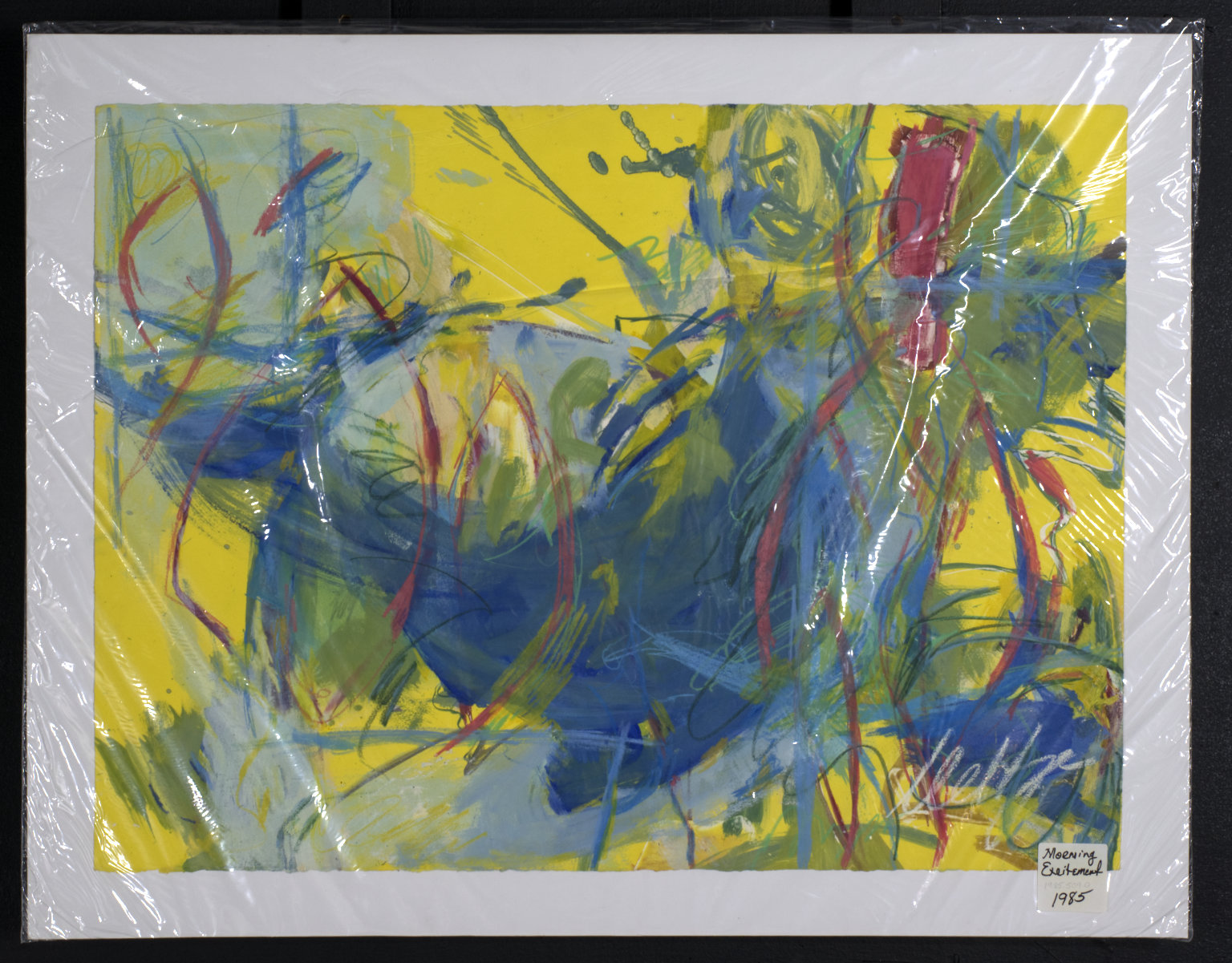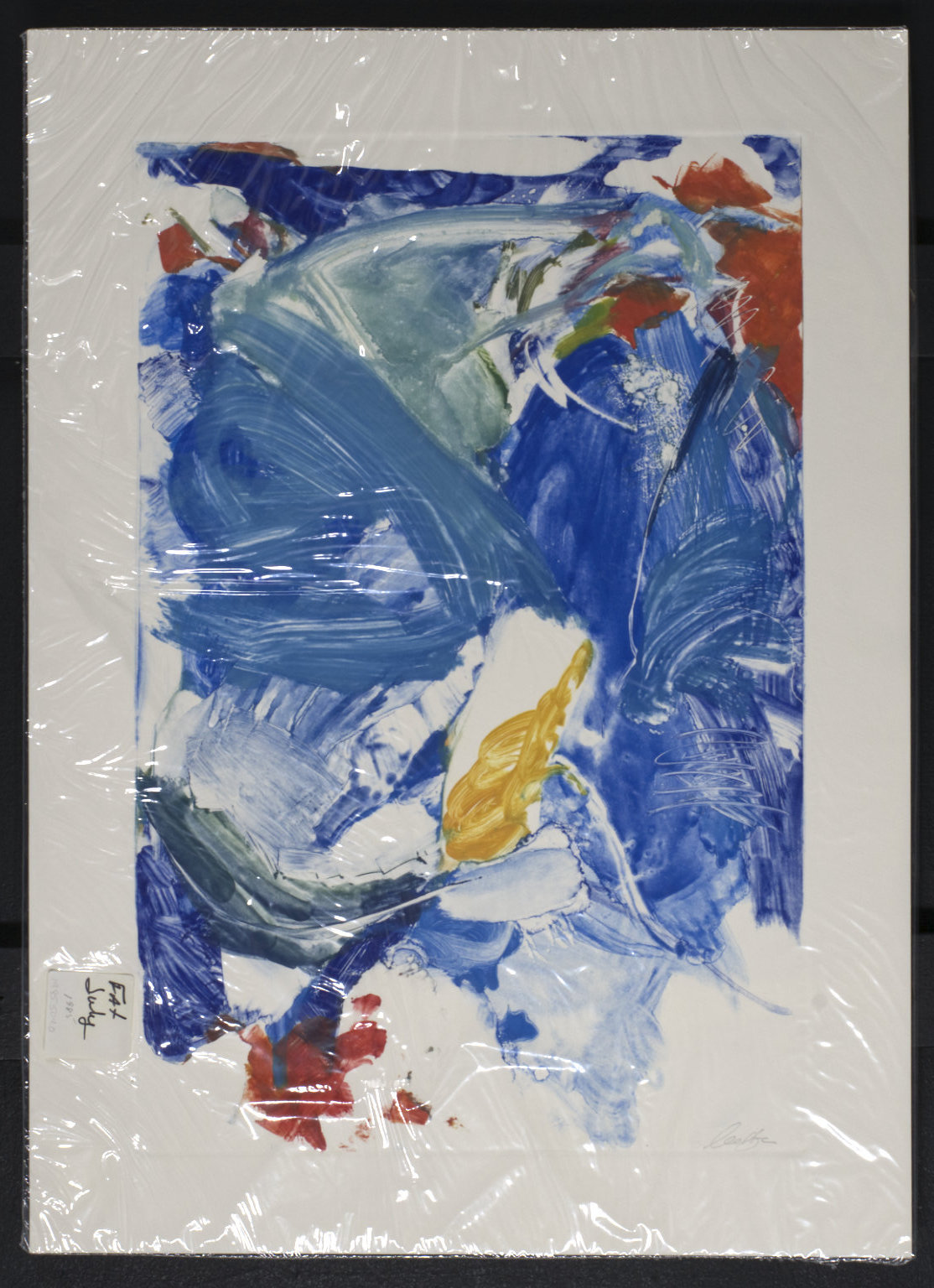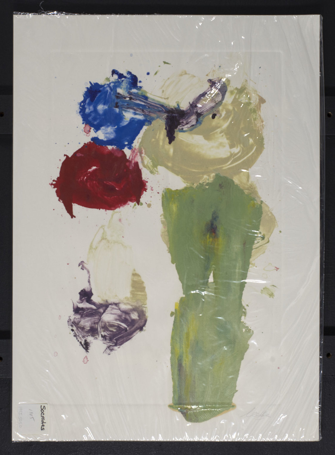 Deckle edge paper. White space across B and in TL. Blue "hand" shape in B half. Red and pink across B. Tan and light green vertically on R edge. BR: 1/1 Neltje 88. Verso, backing board. Nothing.