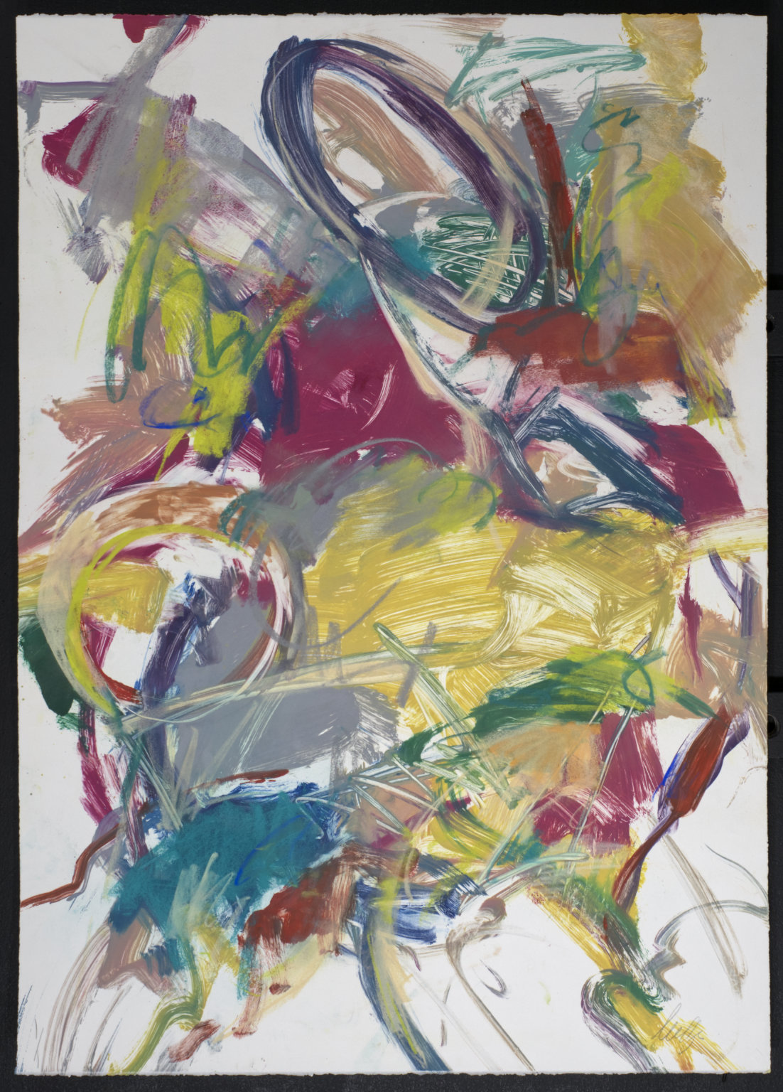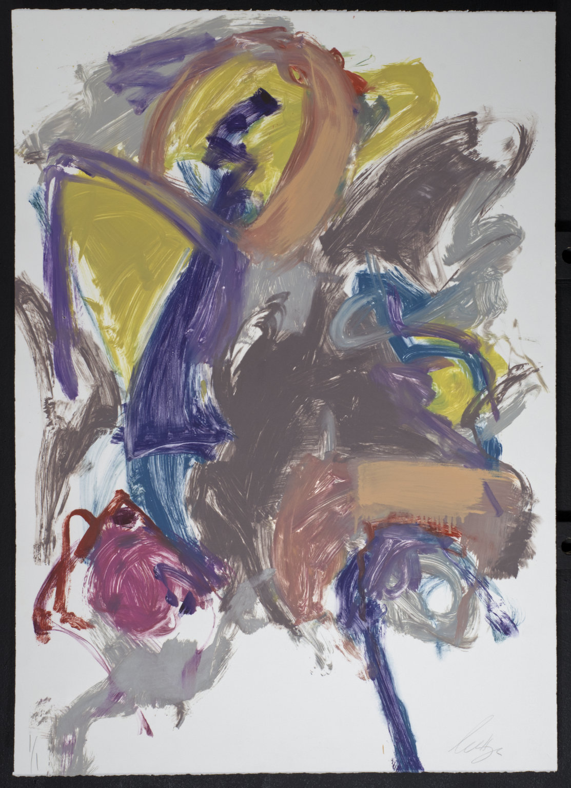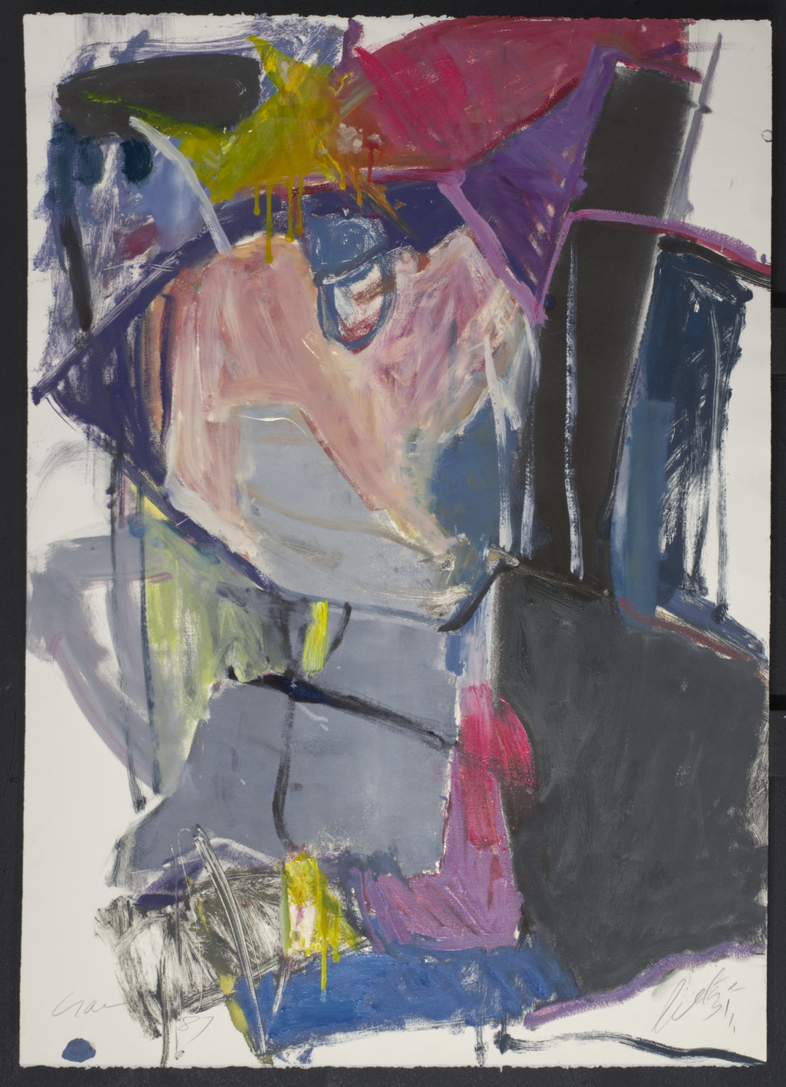Deckle edge paper. A little white space around edges. Yellow with drips in TL. Dark pink in TC / TR. Black vertical area in TR / CR. Black area in CR / BR. Lavender in BC. BL: <illegible> 87. BR: Neltje / 1/1. Verso. Watermark TR: ARCHES / FRANCE <symbol>.