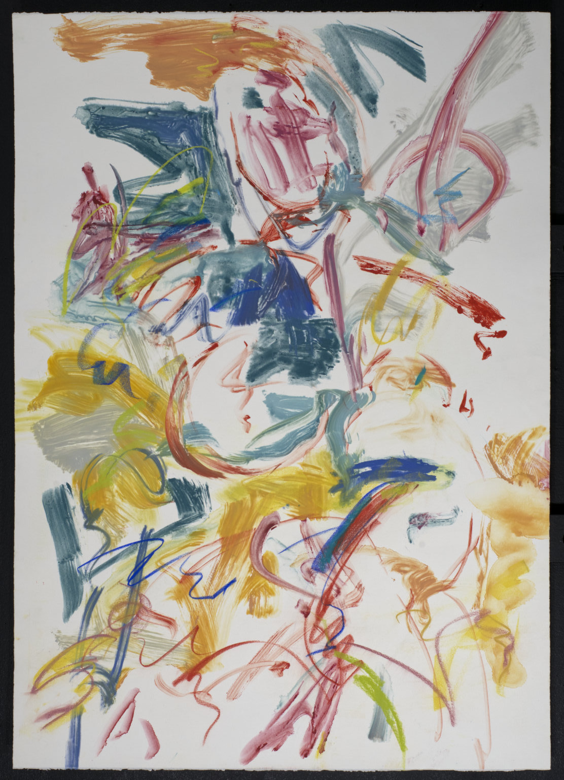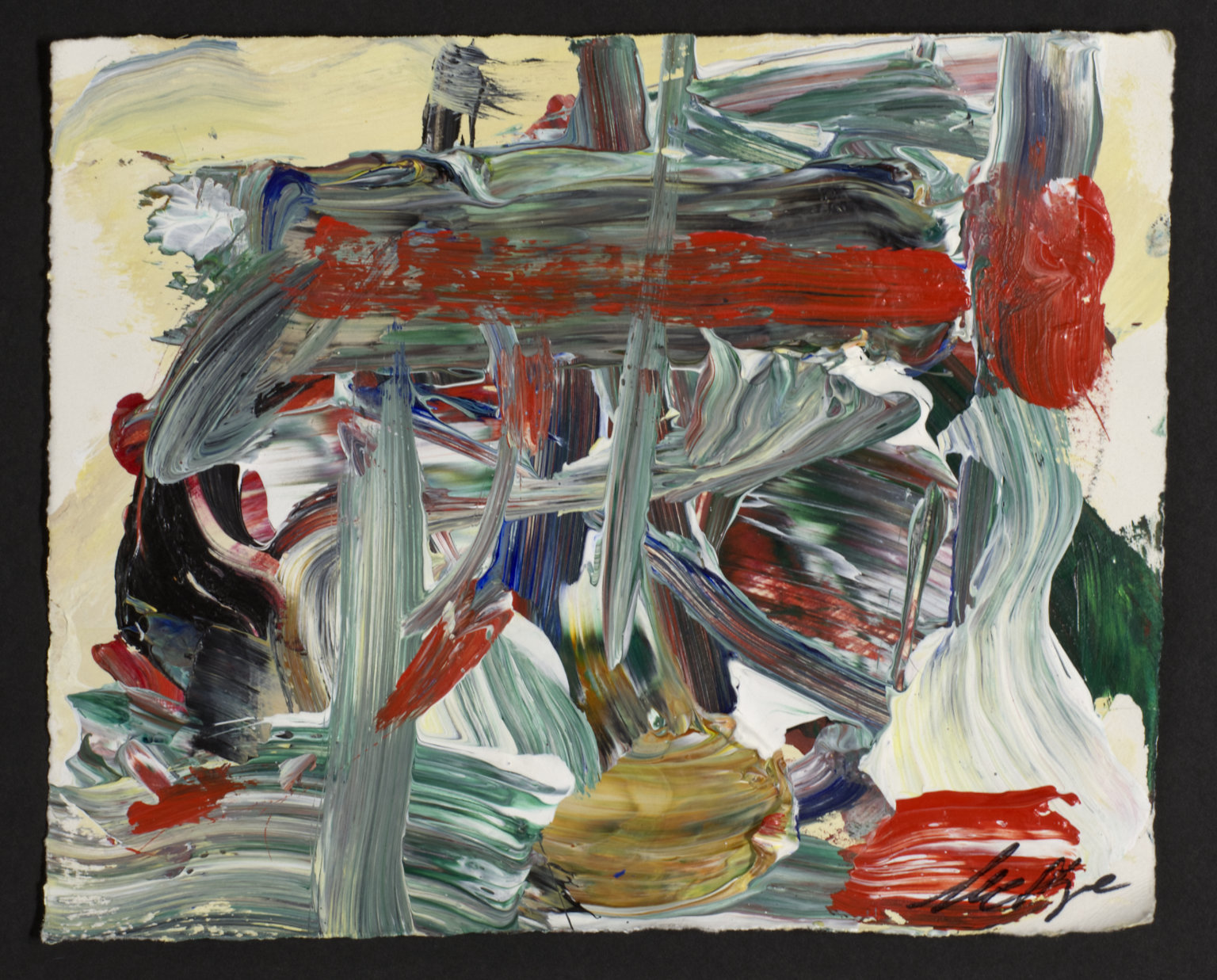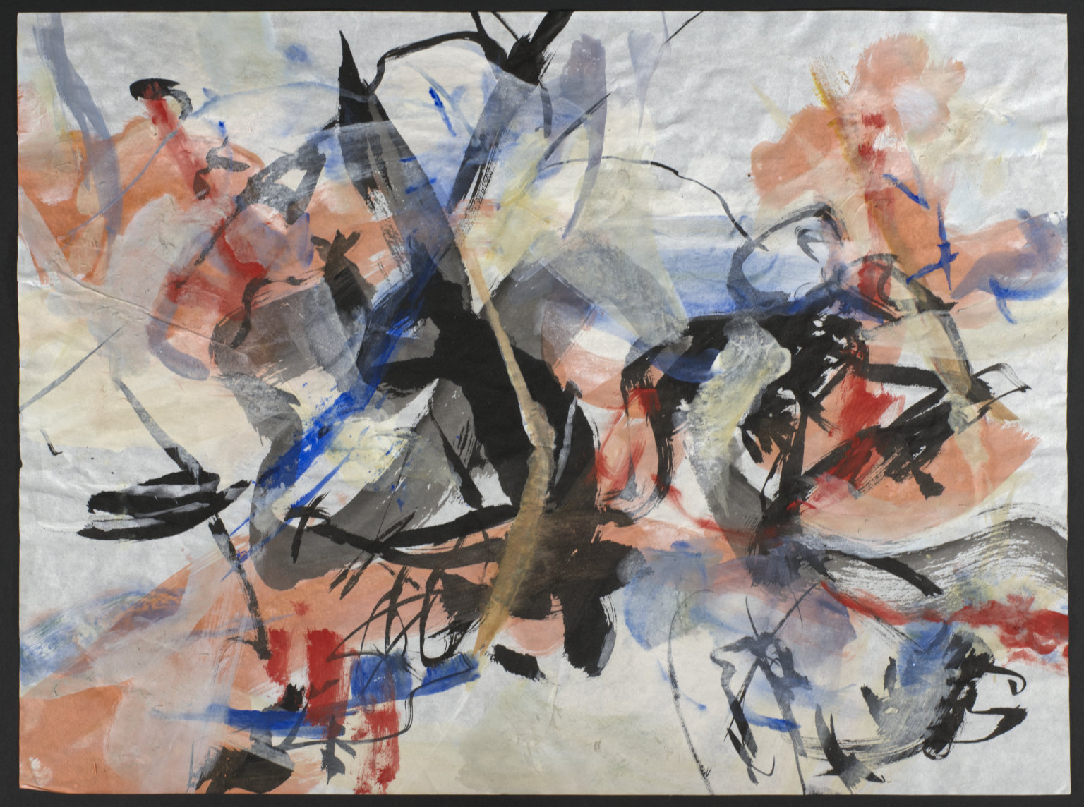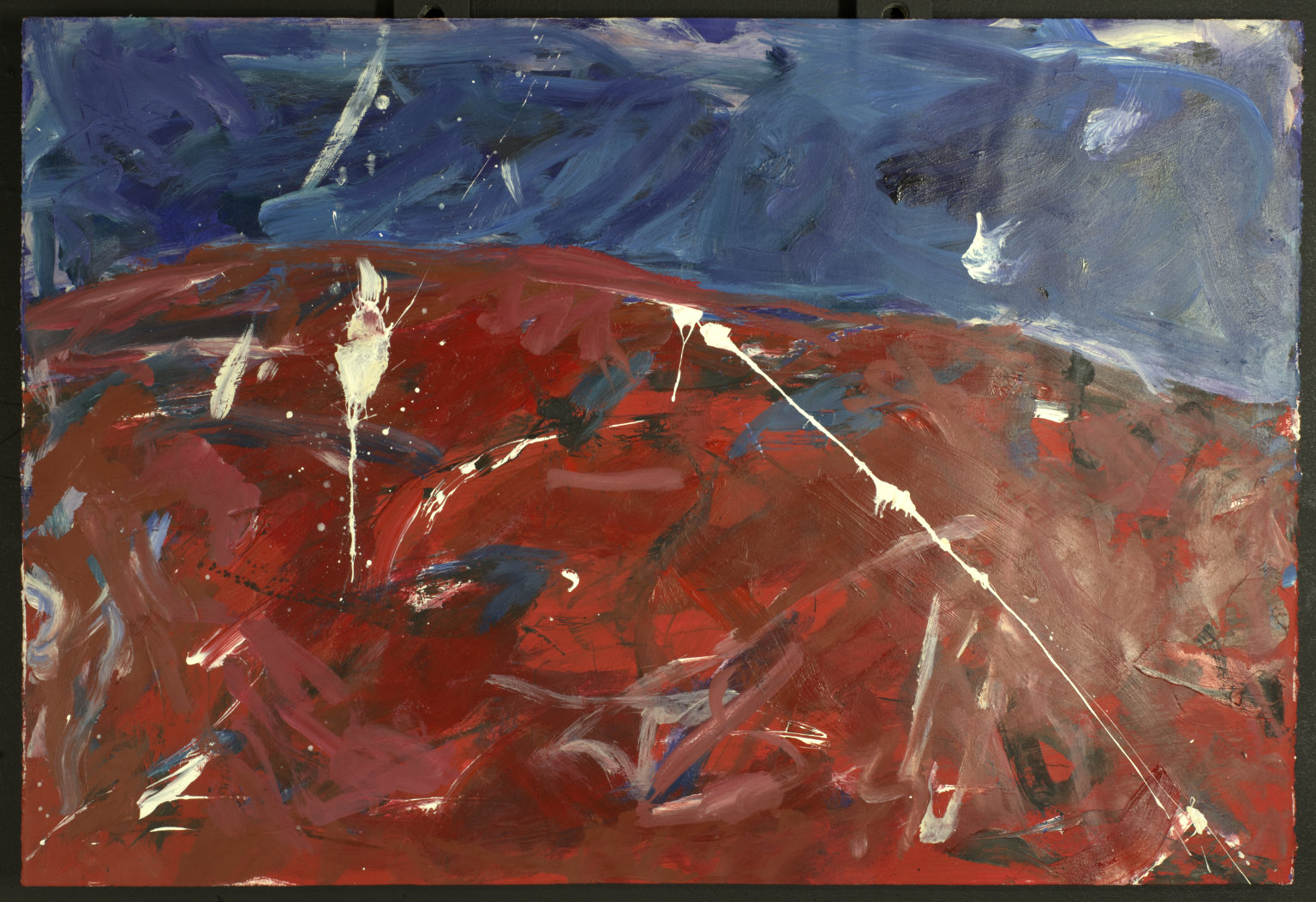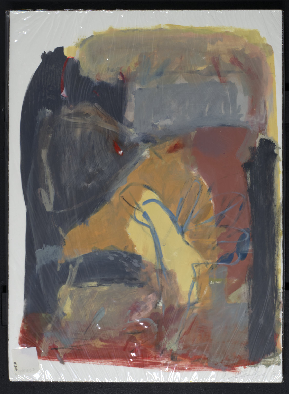 Peach in background. Slightly curved tan line vertically in C. Blue and black throughout. Red primarily on L side and in TR and BR. Verso. Nothing.