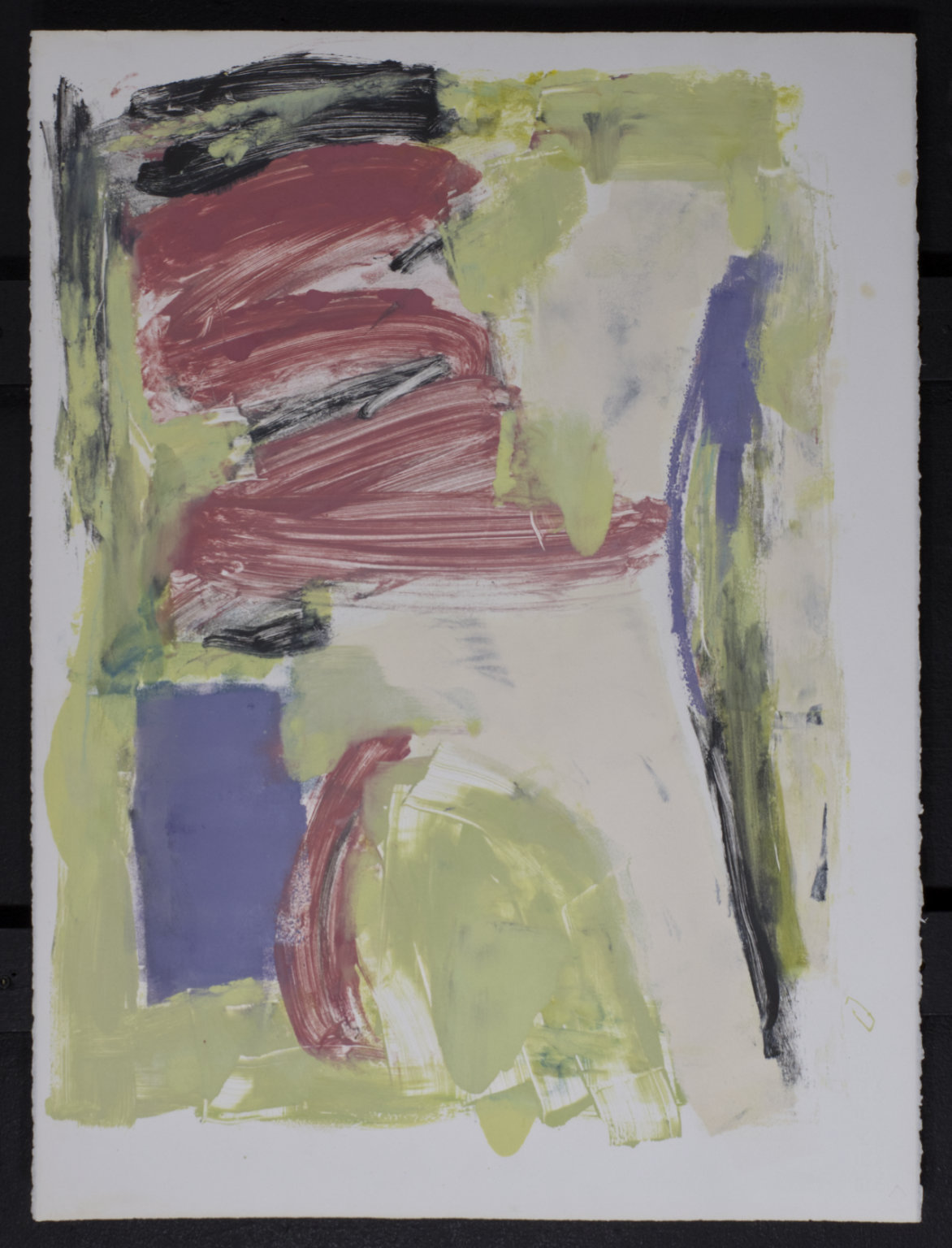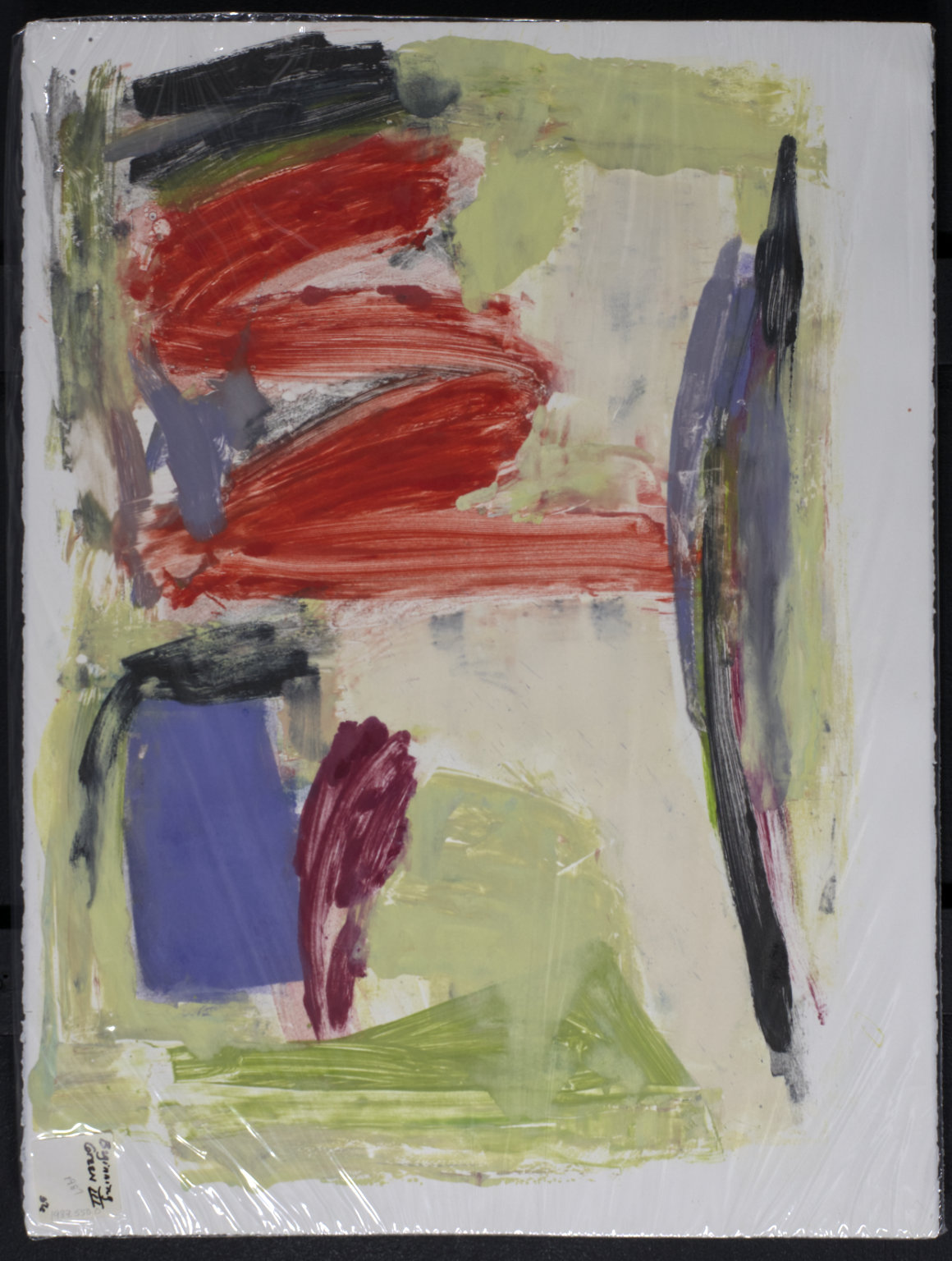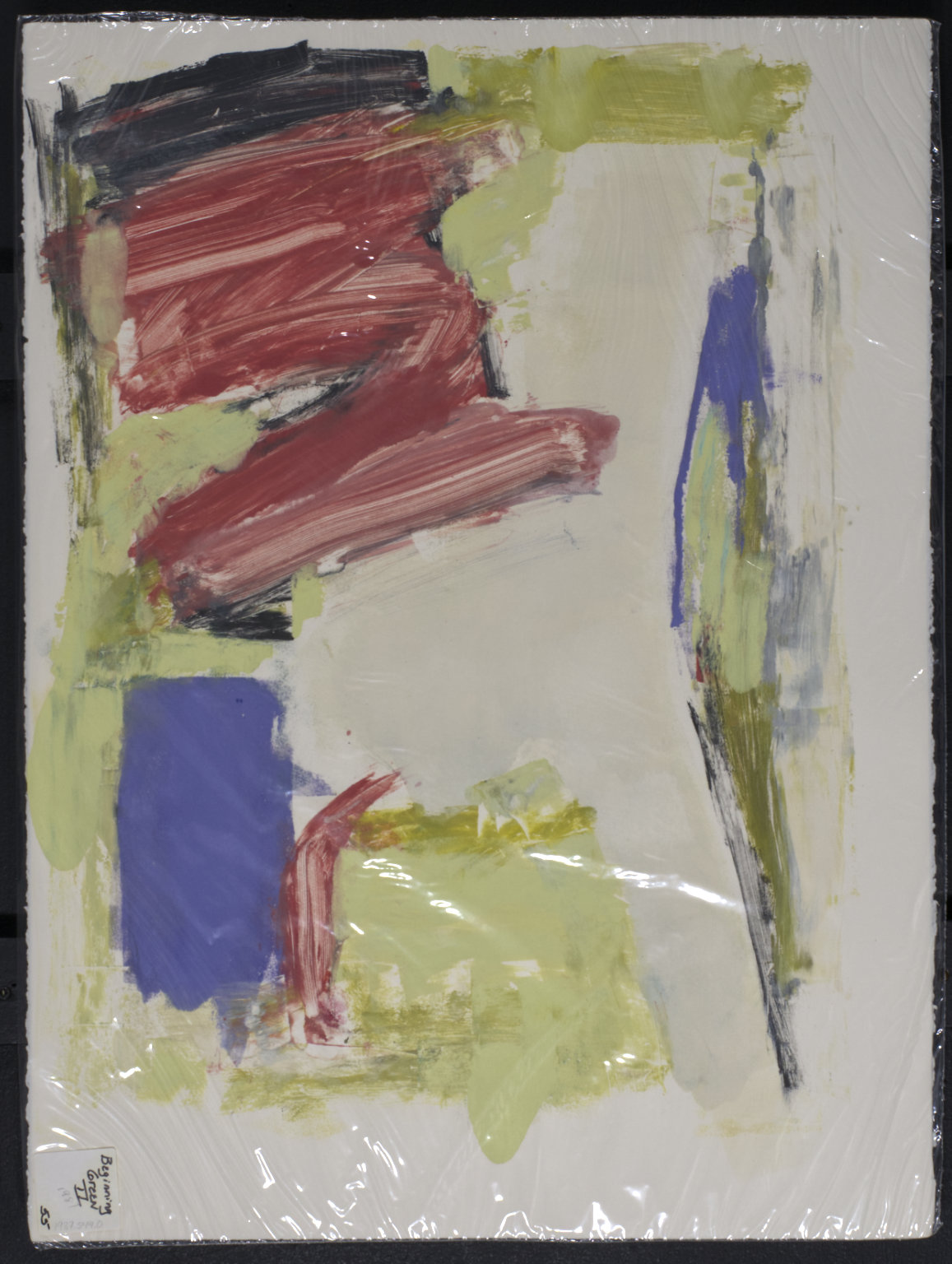 Deckle edge paper. White space around edges. Colors are light green, pink, tan, purple, and black. Almost identical to 1987.548.0, except black vertical line in BR is lighter. Verso. TL: Beginning Green II / 4/87 / 55/87. TR: 55. BL watermark: ARCHES / FRANCE <symbol>. BL stamp is a diamond shape.