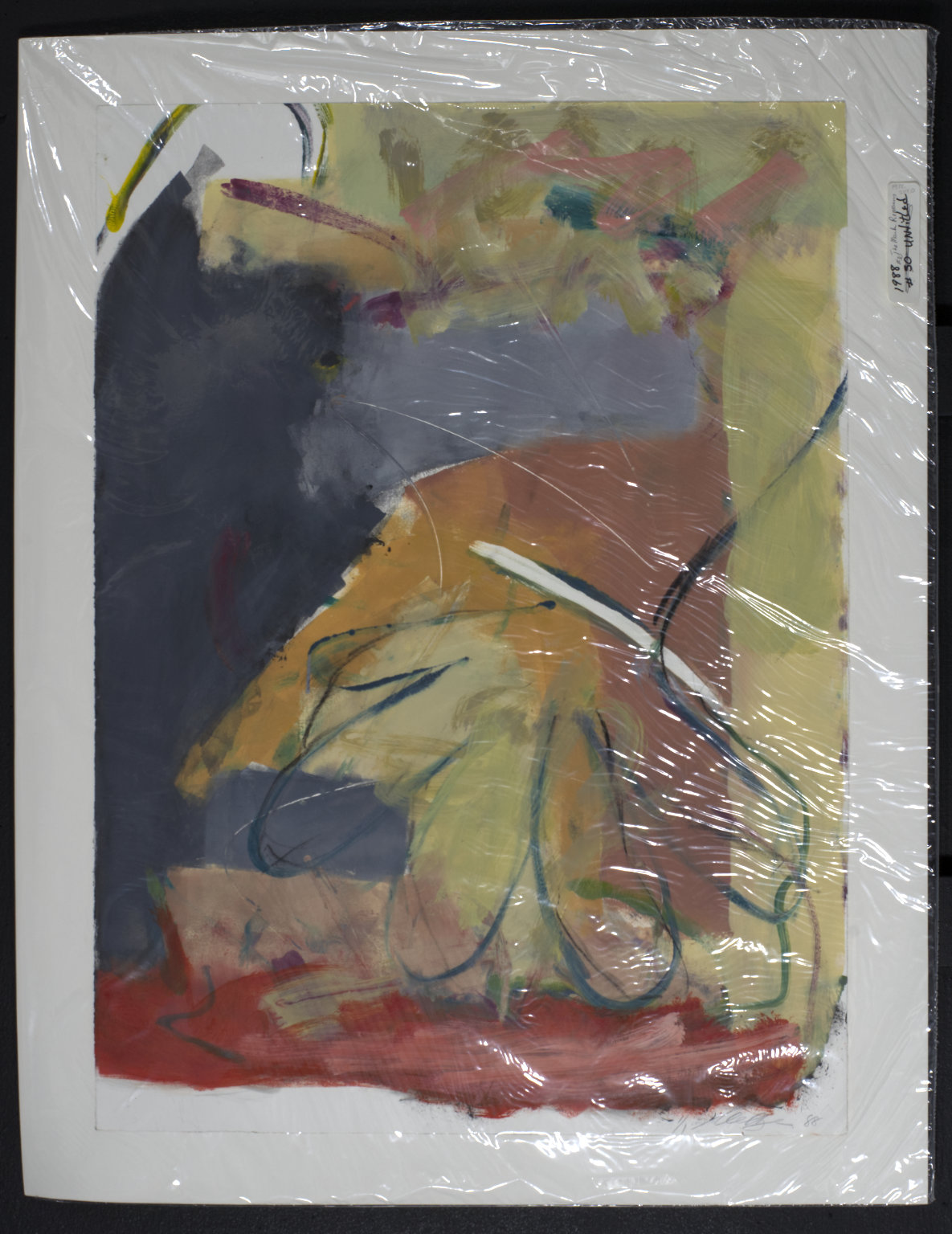 Deckle edge paper. Yellow background. Pink vertical lines throughout. A lot of blues. Circular area in TR. Blue spatter and drops in TC. Verso. Mounted on matboard. Shrink wrapped.