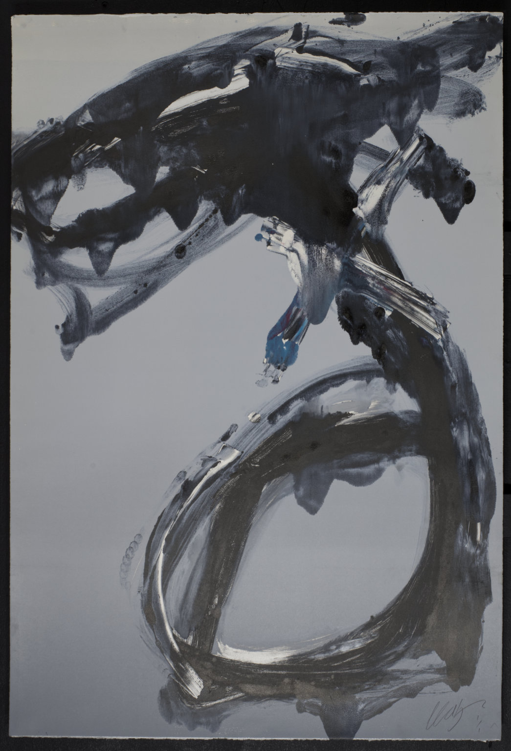 Deckle edge paper. Gray background, darker at T and B. Teal spot in C. Black and white circular shape in B. BR: Neltje 1/1. Verso. TR: 83. BR: 83/88. Watermark BL: BFK RIVES / FRANCE <symbol>. Diamond shape stamp in BL. Tape across T and B (3 pieces on each side) and 1 piece in CL.