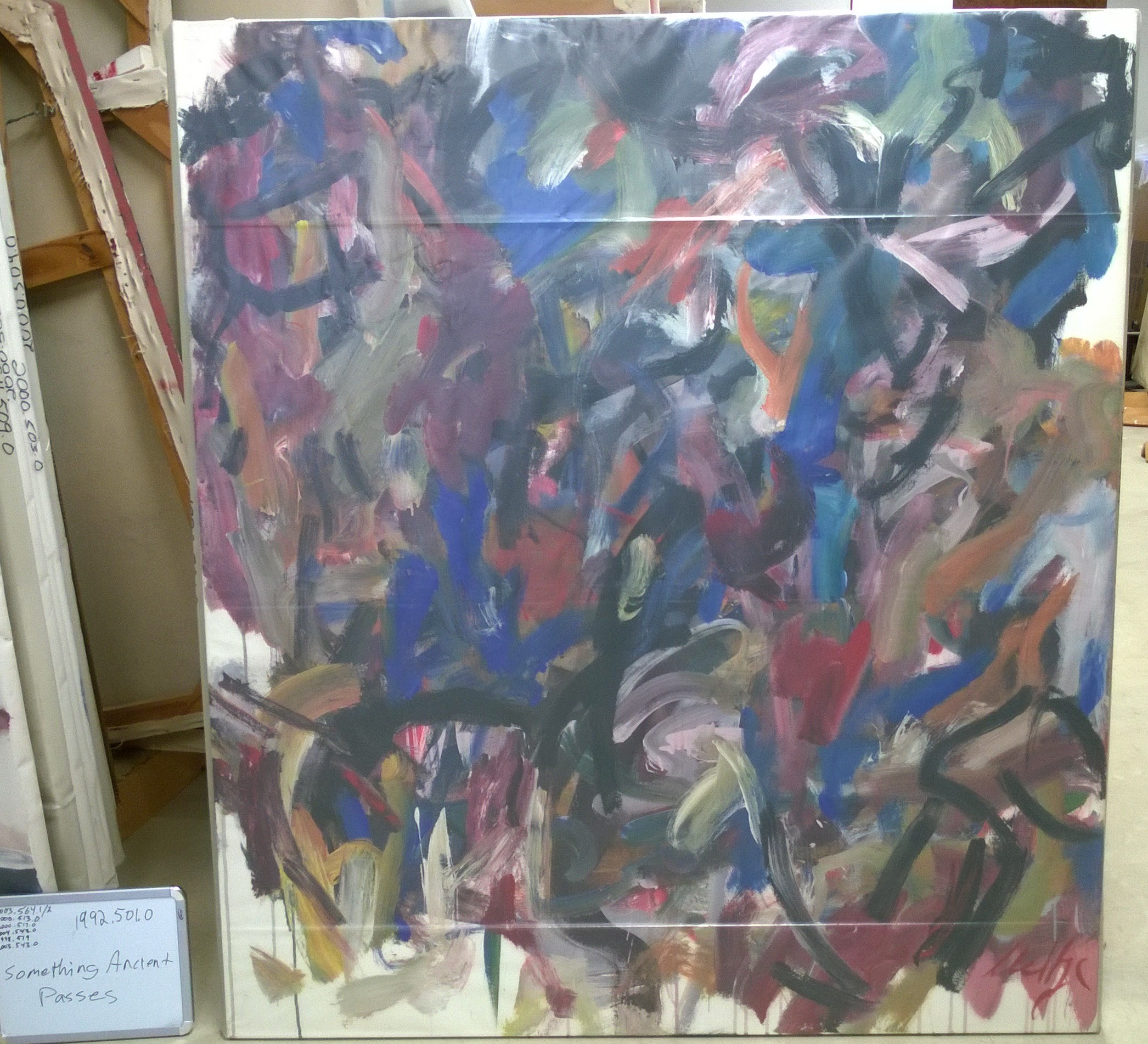 Multiple colors including blues, reds, greens, browns, black. Some white space in corners and bottom edges. Pink drips into white in BC / BR. Signature in red over pink in BR. Verso. TL: Something Ancient passes / N.Y 1992. TC vertical stretcher bar: NELTJE / Something Ancient Passes / Acrylic on Canvas 1992 / 54" x 48" 8. Below: Something / Ancient / Passes / 1992. Stamped on both C stretcher bars: TRI-MAR / ENTERPRISES INC. / HAND-MADE USA. BL vertical stretcher bar: 54 x 48. Stretcher has screws and can be keyed.