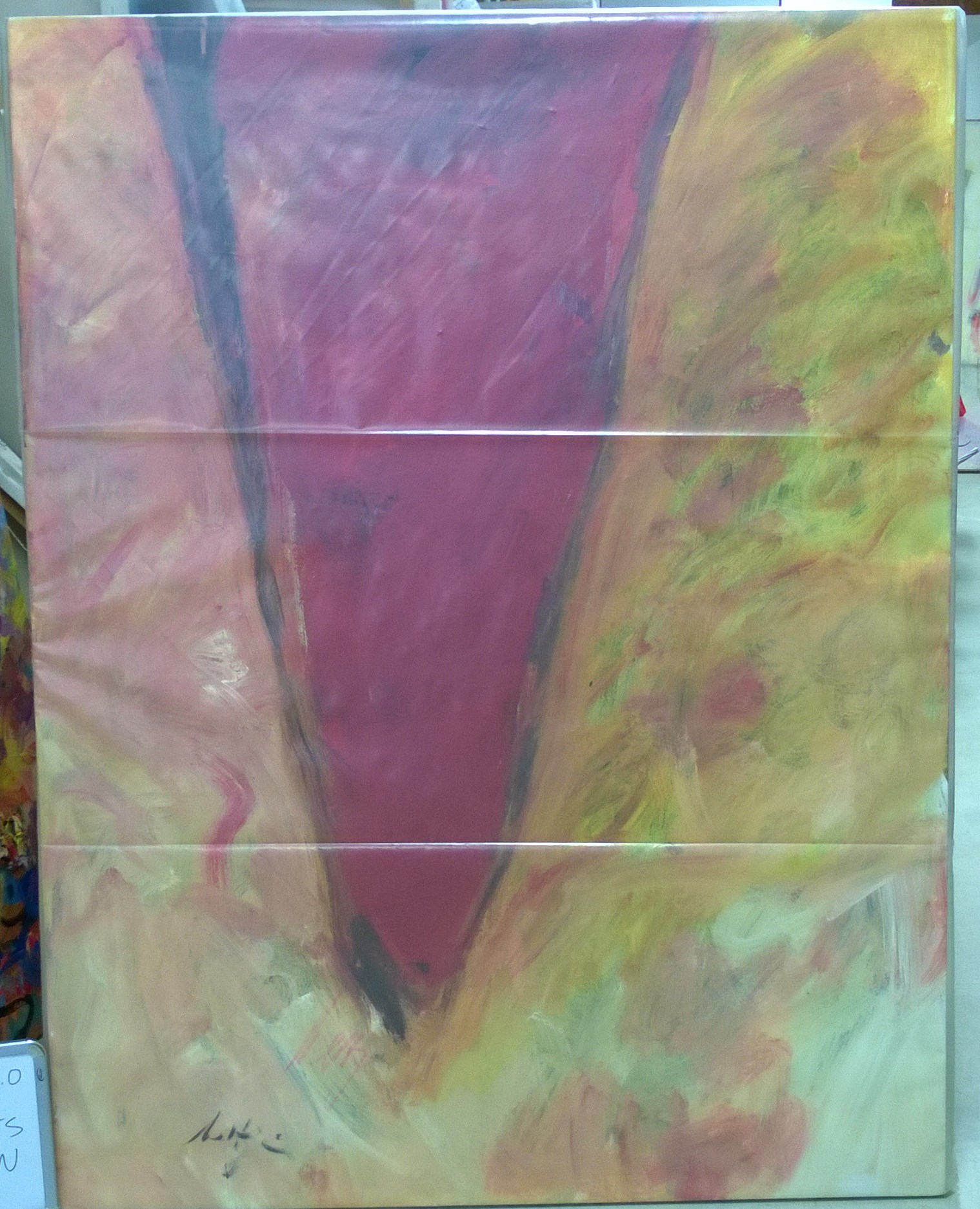 Red area fills TC down to BC, tapering off to a dull point in BC. Edged in darker paint. Background is yellows, red, greens, tans. BR corner is light tan. Verso. TL: When it comes to your / own. NY. 1992. TR: Wh. Sticker on C stretcher bar: NELTJE / When It Comes To Your Own / Acrylic on Canvas 1992 / 40" x 52" 11. And: 40. Stamped twice on C stretcher bars, once under sticker: TRI-MAR / ENTERPRISES INC. / HAND-MADE USA. Stretcher has screws and can be keyed.
